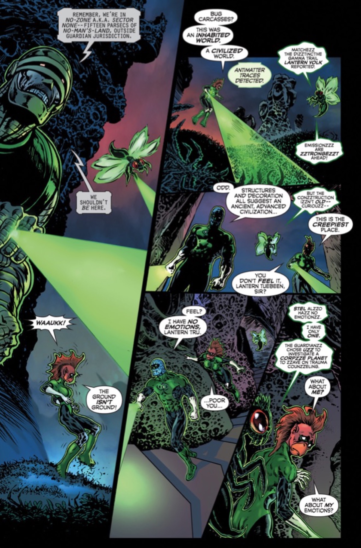 At the risk of Grant Morrison appearing via astral projection in our living room and blasting us with a hex, here's two pages from next Wednesday's Green Lantern #11, as the Green Lantern Corps investigates the murder of a planet. Is Climate Change the culprit? Well, not this time. Check out the preview below.