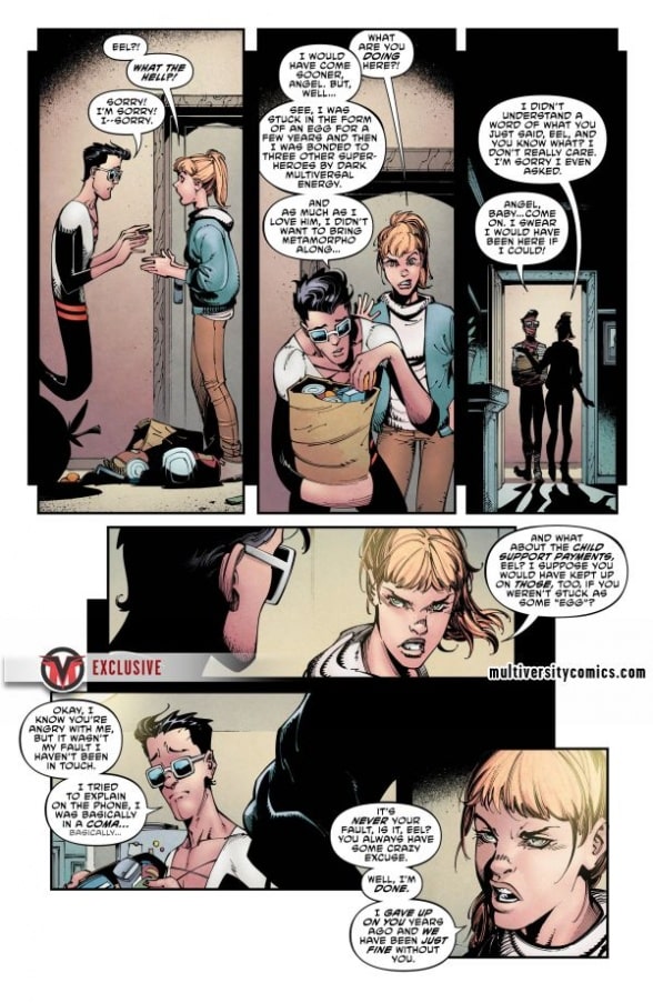 Yeah, we're pretty sure you gotta pay that child support even if you're stuck as an egg due to a super-mega-crossover event. Eel tries to explain the circumstances, but Angel has had enough…