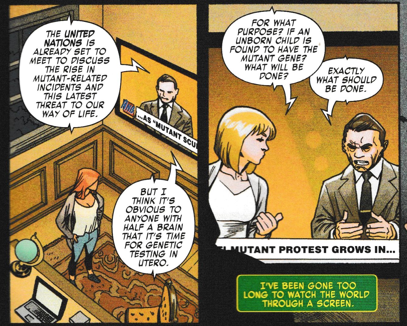 The elements of hate begin to grow, with the United Nations getting involved, and America is considering in-utero testing for mutants. The politics in this issue are embedded, and uncomfortable, phrases such as "on both sides" deliberately refer to modern American politics and the usual voices are flipped, children seen as terrorist weapons, conservatives calling for abortion, liberals fighting against such a test, and other countries legalising the imprisoning of mutants or the legal killing of those suspected to be mutants.