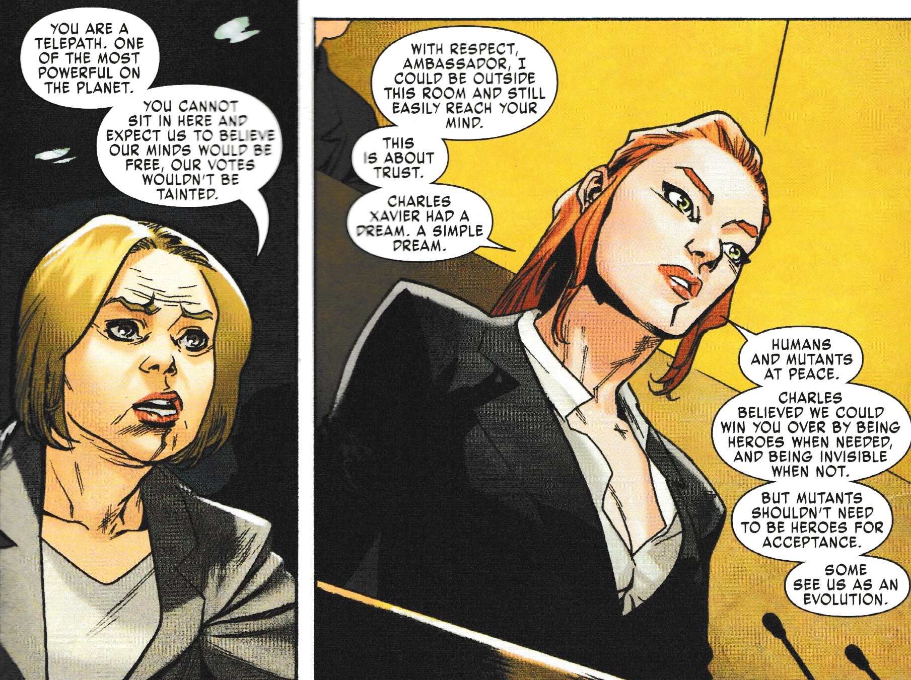 And Jean Grey, with the support of others considering a new solution. Not a new country or state, but not an unrecognised minority spread across the world, but something else, a new kind of political solution. And she sets out to use her brain to achieve it. But others have their own opposing agenda. Things go wrong. And fear and hate are on the rise again from a familiar face we haven't seen for a while.