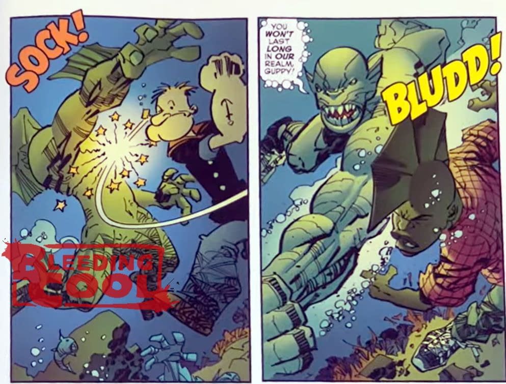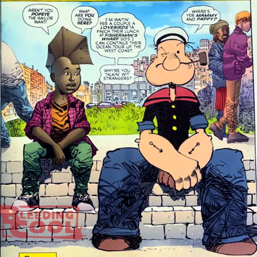Erik Larsen is not quite as rough on Popeye The Sailor Man, who beats IDW's The Rocketeer to publication in Savage Dragon, meeting Tyrone Dragon on the dock of the bay, watching the ships coming in and going out again.