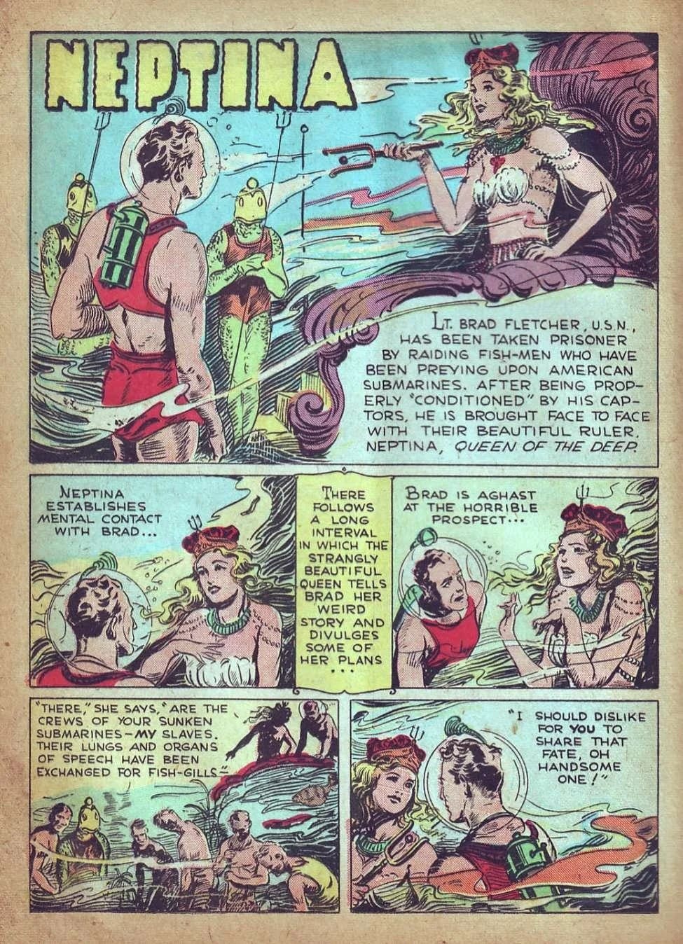 Because that's Lt Brad Fletcher, who appeared in Neptina, Queen Of The Deep, in Champion Comics #2-17 back in 1939, who was sent to investigate the disappearance of U.S. submarines but instead found a race of fish-men who gave Brad a special bubble for breathing underwater, and ended up getting involved in their wars.