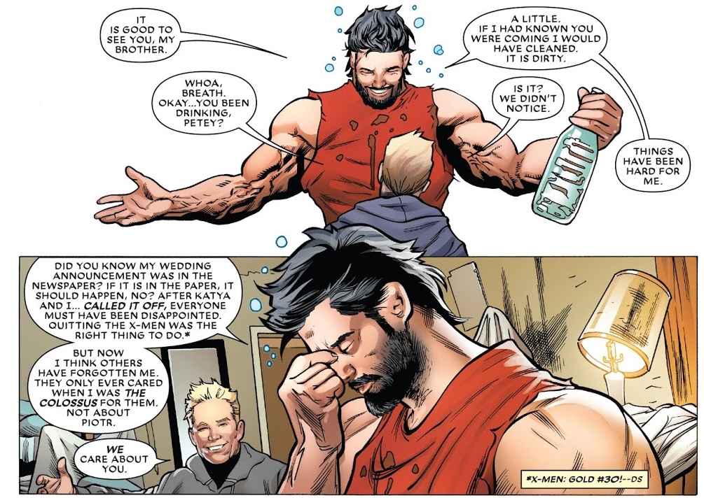 Kitty Pryde asked Colossus to marry him. He said yes. Then, at the altar, she changed her mind. And Rogue and Gambit took their spot. Kitty Pryde continues to lead the X-Men. And in today's Astonishing X-Men #14, from Matthew Rosenberg and Greg Land, we get to see how Colossus is doing.