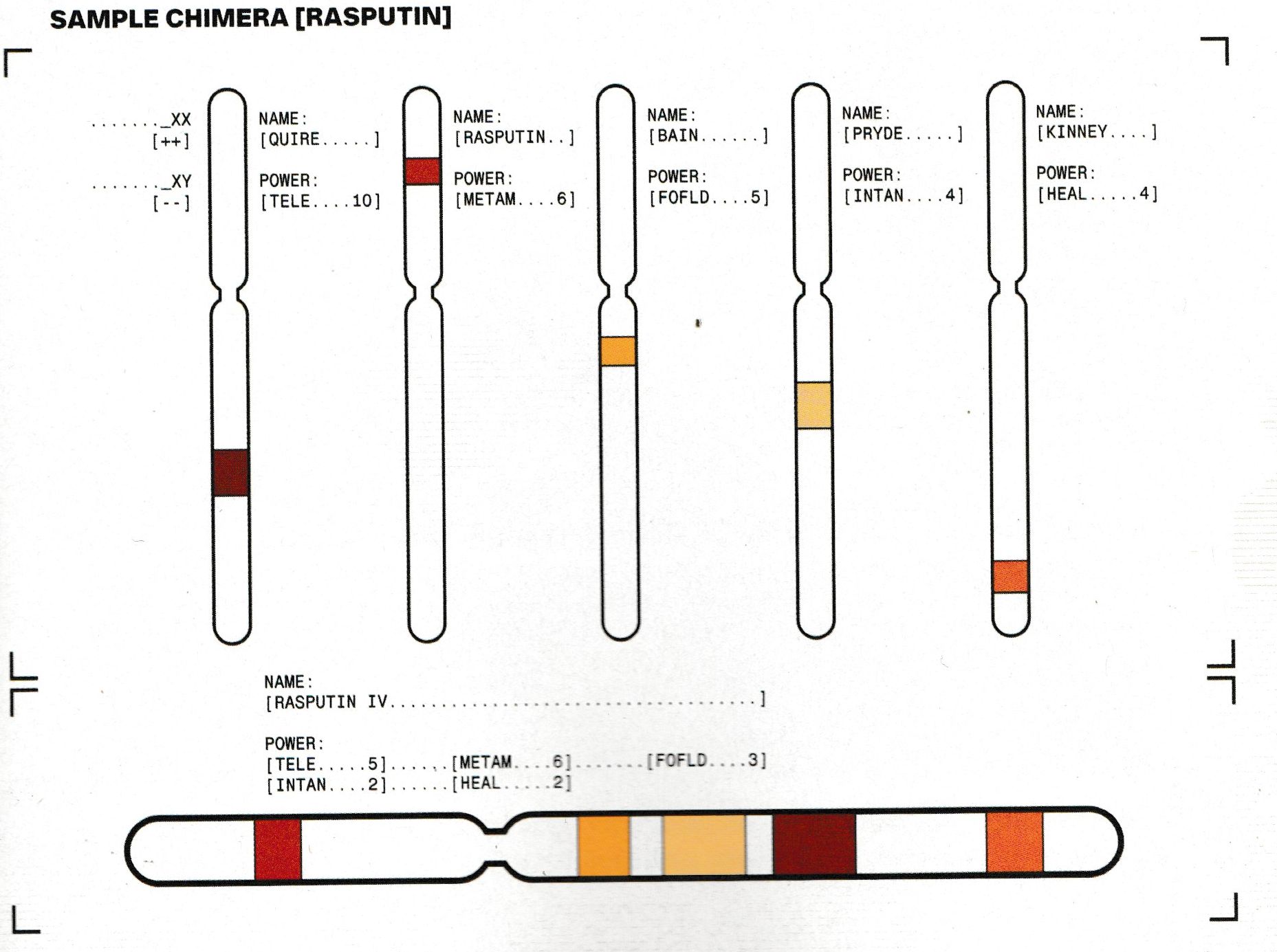 …she's a chimaera, designed by Mister Sinister to combine mutant powers, and used as hounds to hunt mutants, but their instability and power base caused them to rebel. So what is inside Rasputin's DNA makeup? Oh look, we have a diagram…