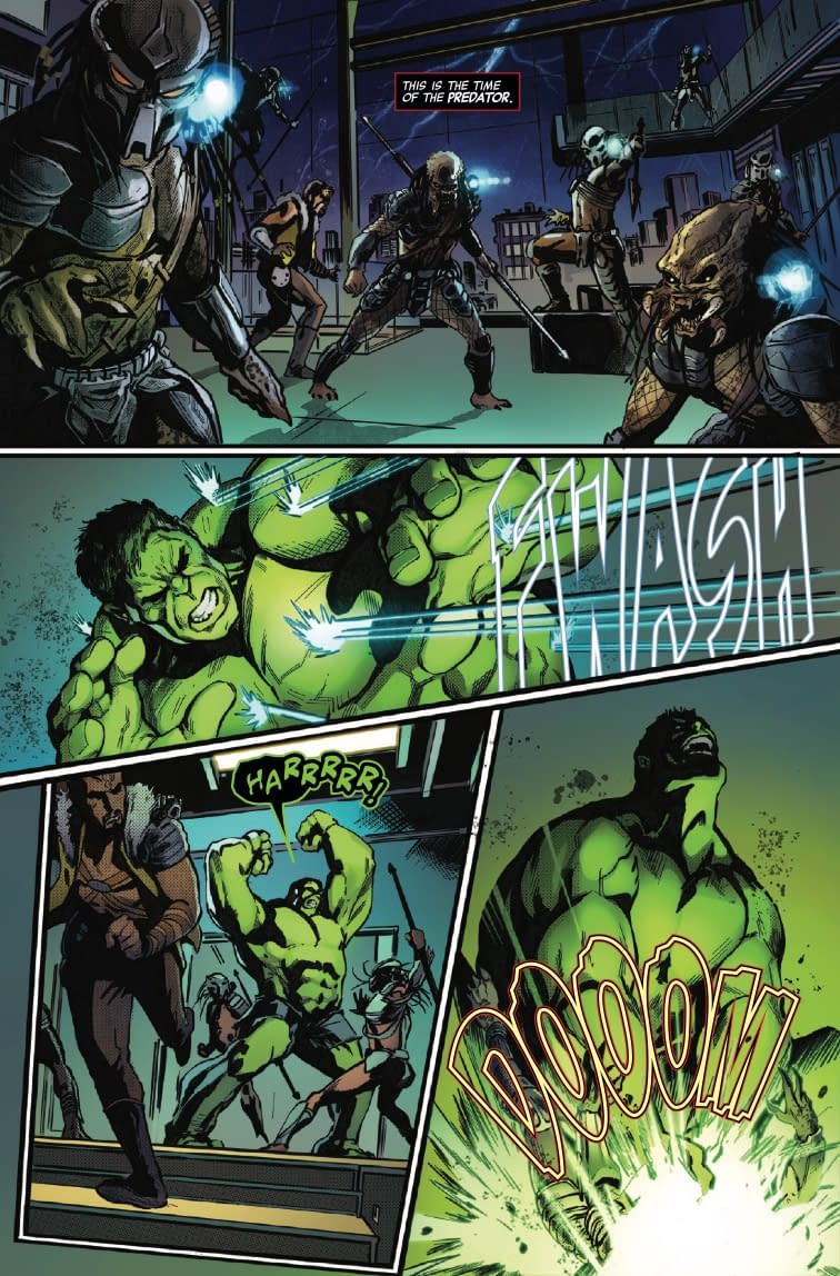 - Surviving Marvel heroes are hunted as "prey" by Predators in this action-packed, continuity-shattering issue.
