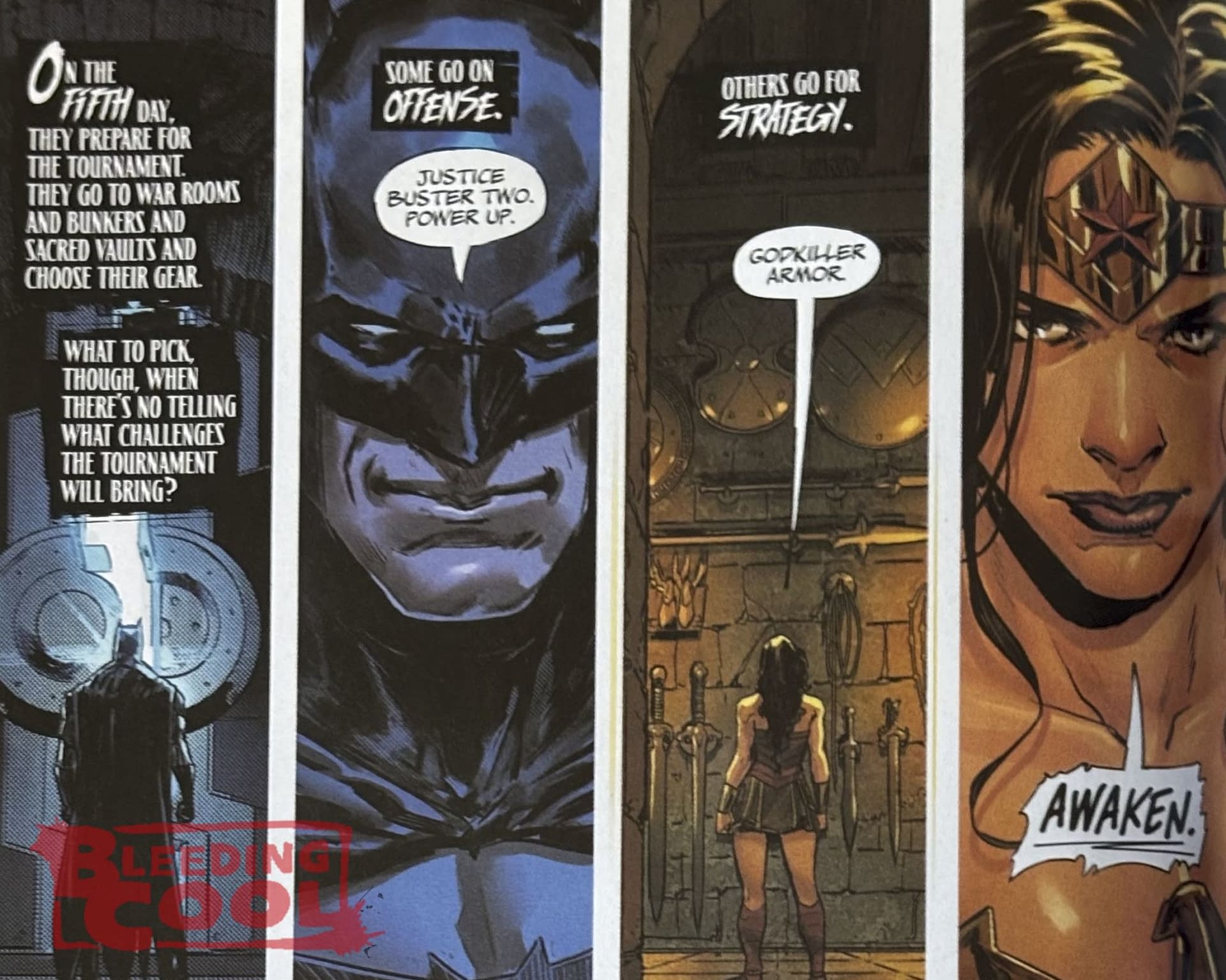 - Heroes like Batman, Wonder Woman, and Superman arm up with unique weapons for a high-stakes tournament.