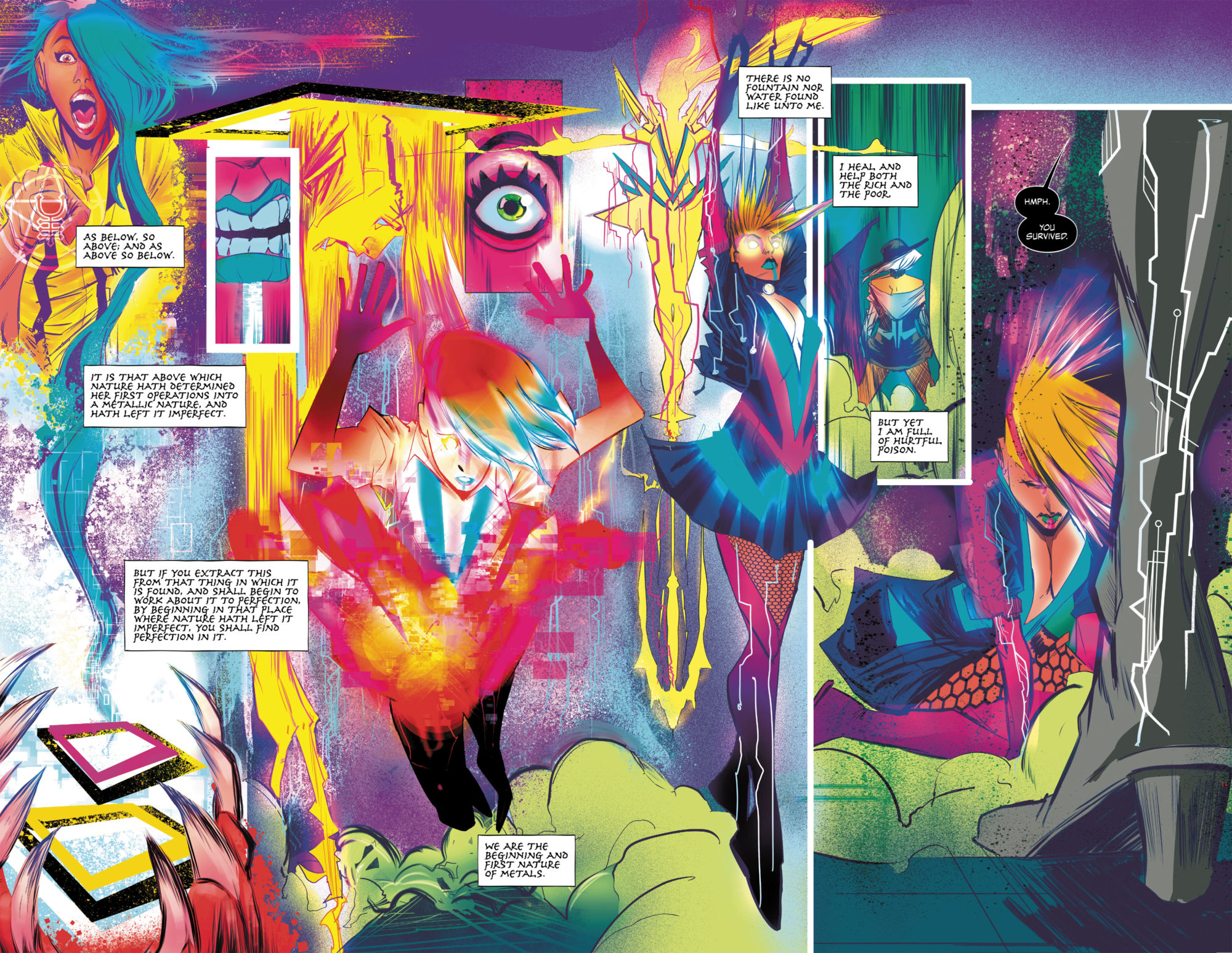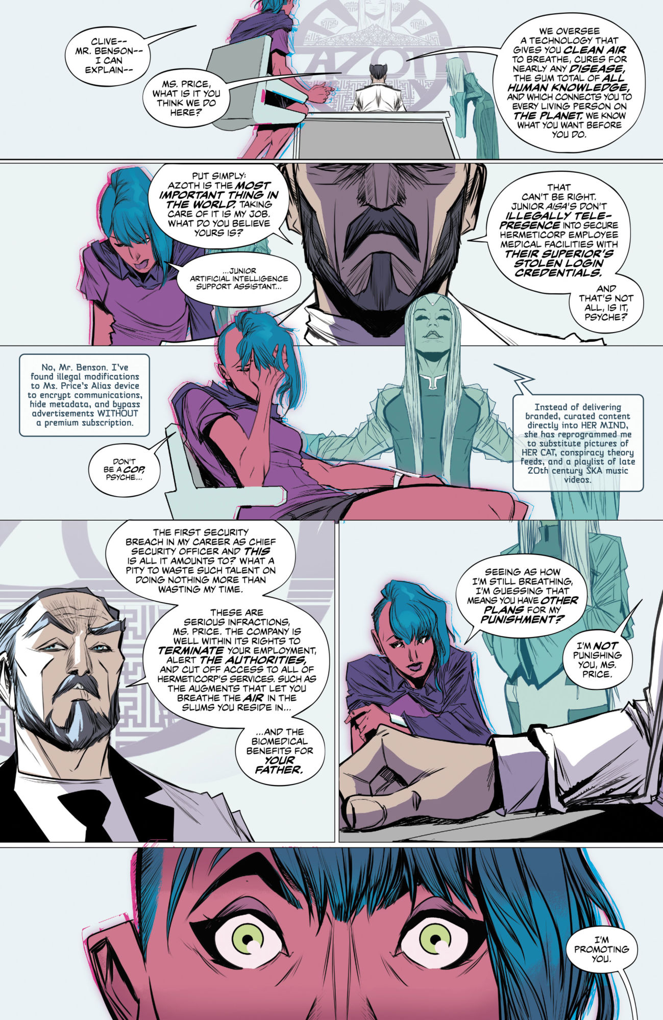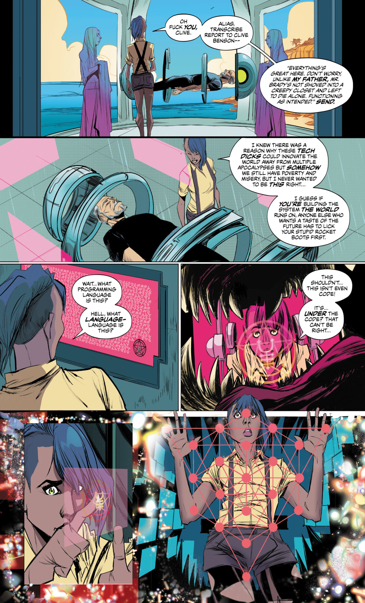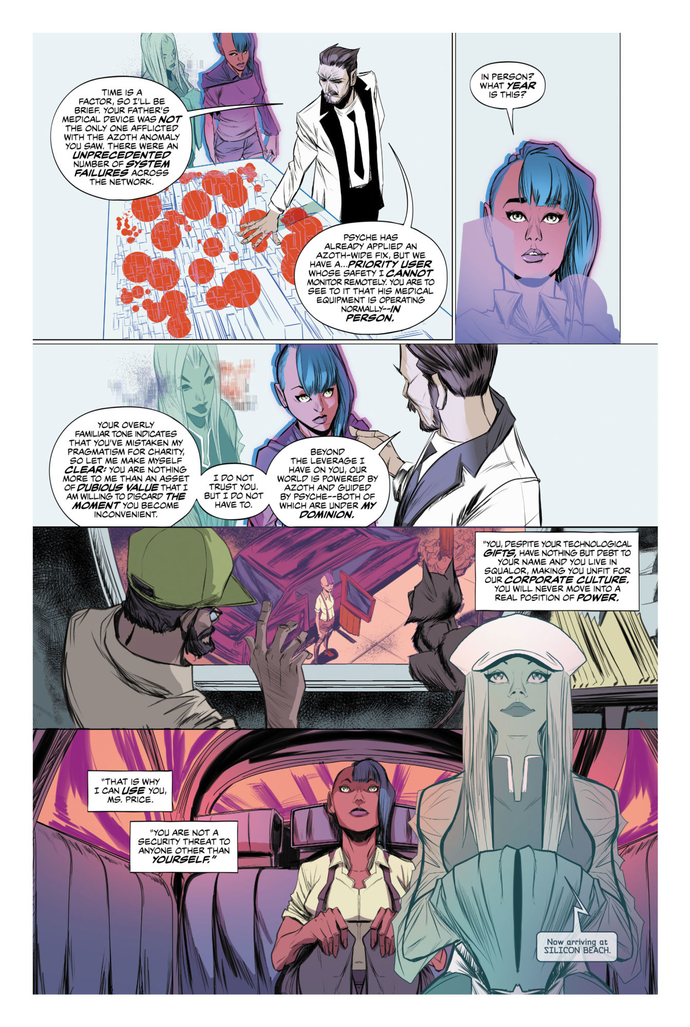 Goddess Mode, launching from DC/Vertigo tomorrow. A future sci-fi world in which technology controls everything and access to that technology is controlled. Aside from those who sidestep the system, get caught, get swallowed back up by the system and get used for the system's own purposes.