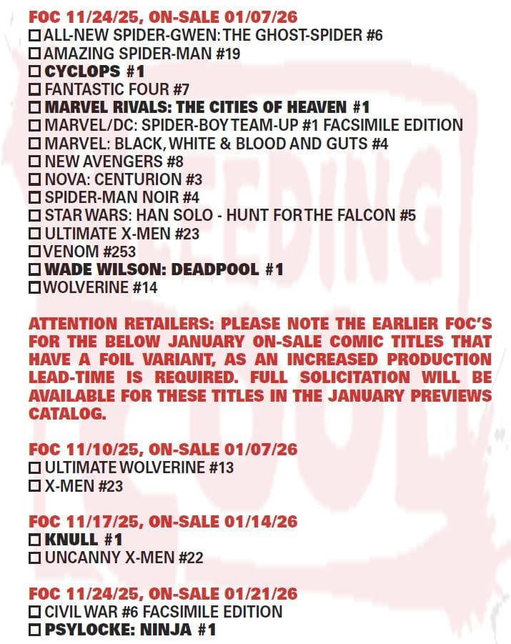 - Release dates and issue list revealed for January 2026, spotlighting Cyclops and key Marvel titles
