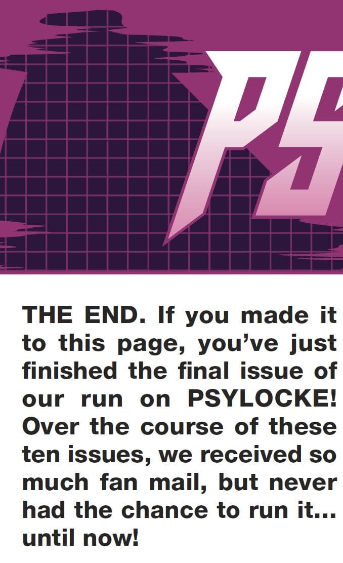 "THE END. If you made it to this page, you've just finished the final issue of our run on PSYLOCKE! Over the course of these ten issues, we received so much fan mail, but never had the chance to run it… until now!"