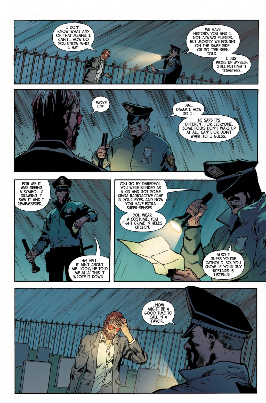 It seems like the residents of comic book universes can't go more than a couple years without someone shaking said universes to their foundations, ensuring that nothing is ever the same again. But in next week's Marvel Knights 20th #1, the change happened quietly, and only a few people have noticed. Frank Castle, now a cop, is one of them, as is Bruce Banner, and in this preview of next week's issue, Castle is trying to awaken an amnesiac Daredevil as well.
