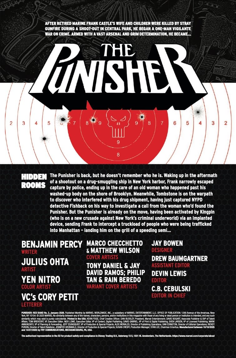 - Cover image for 75960621144900311 PUNISHER: RED BAND #3 MARCO CHECCHETTO COVER, by Benjamin Percy & Julius Ohta & Marco Checchetto, in stores Wednesday, November 19, 2025 from Marvel