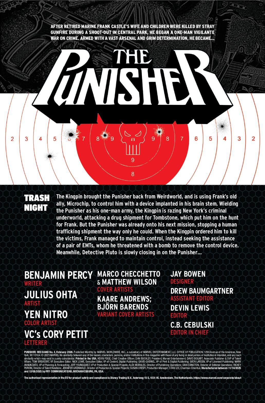 - Cover image for 75960621144900411 PUNISHER: RED BAND #4 MARCO CHECCHETTO COVER, by Benjamin Percy & Julius Ohta & Marco Checchetto, in stores Wednesday, December 31, 2025 from Marvel