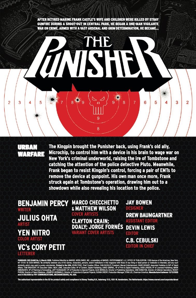 - Cover image for 75960621144900511 PUNISHER: RED BAND #5 MARCO CHECCHETTO COVER, by Benjamin Percy & Julius Ohta & Marco Checchetto, in stores Wednesday, January 28, 2026 from Marvel
