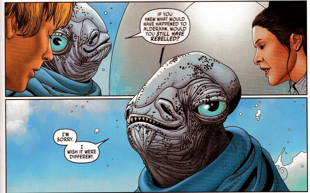 We get the introduction of General Urtya of the Mon Carla Mercantile Fleet. With an attempt to get him, and his ships, to join the Rebel Alliance against the Empire. And who asks Princess Leia a question she cannot answer.