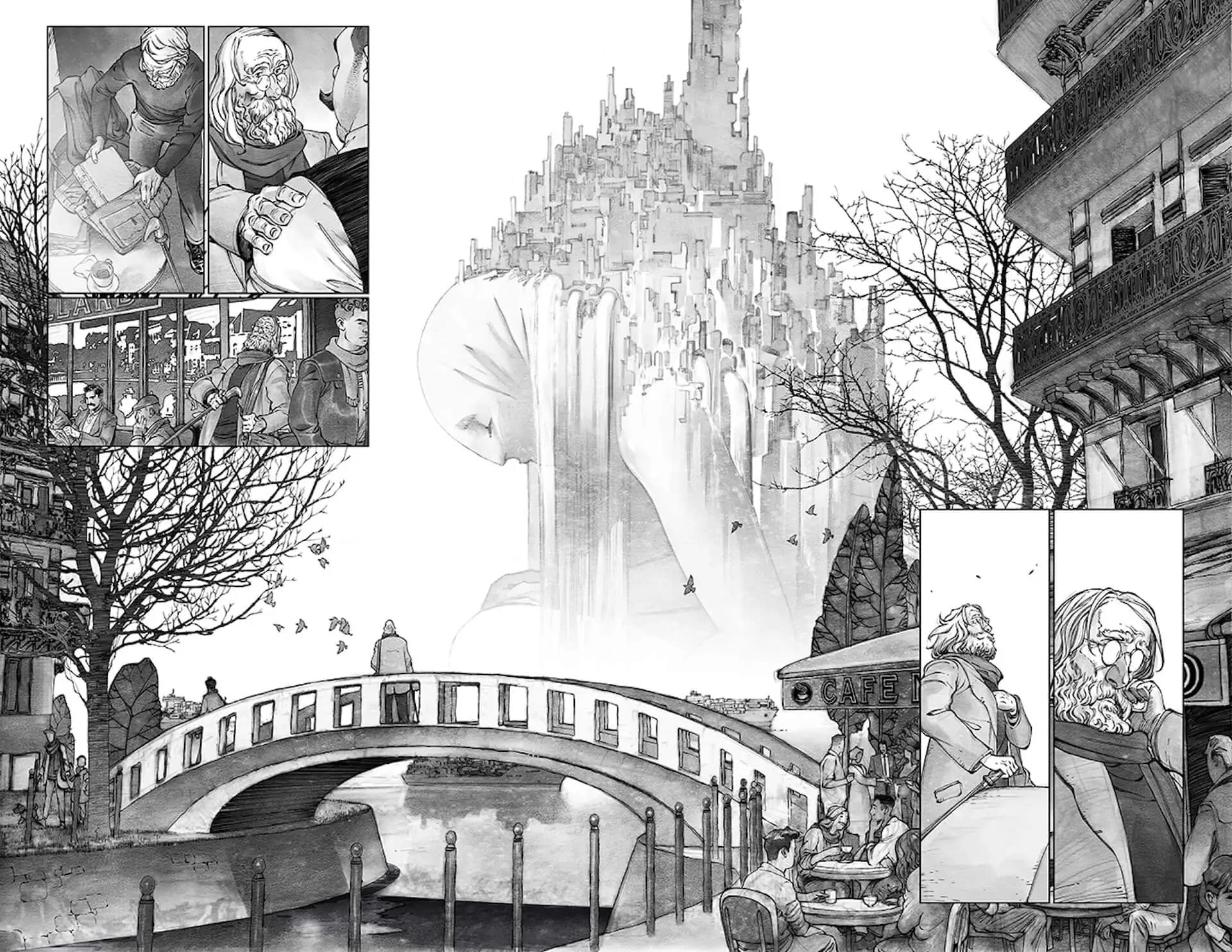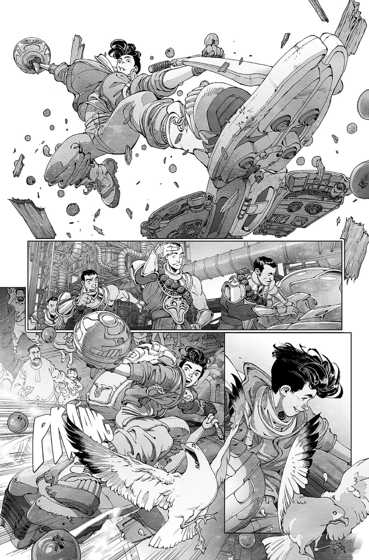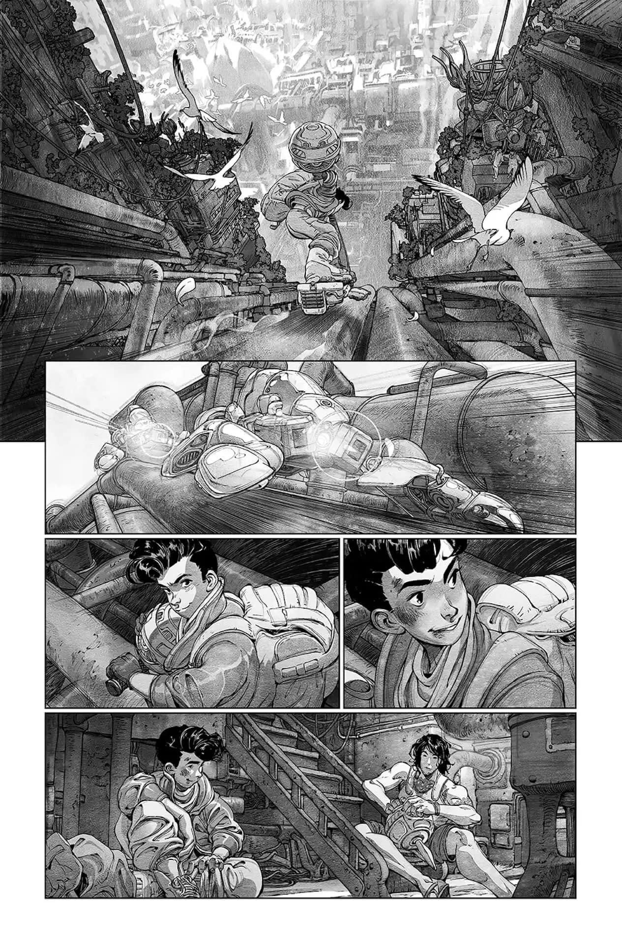 "I see every story as a chance to explore new artistic territory, and the world of Deicidium really demands a commitment to that approach to visual storytelling. The mix of competing cultures and religious influences, the globe-trotting tours of the ways people live in this future world, the character designs, the tech—all of it serves as a summon to dig deep into style and technique in order to create a unique visual language. My hope is that the art of Deicidium feels somehow both ancient and novel, just like the narrative to which it's wed." – Evan Cagle