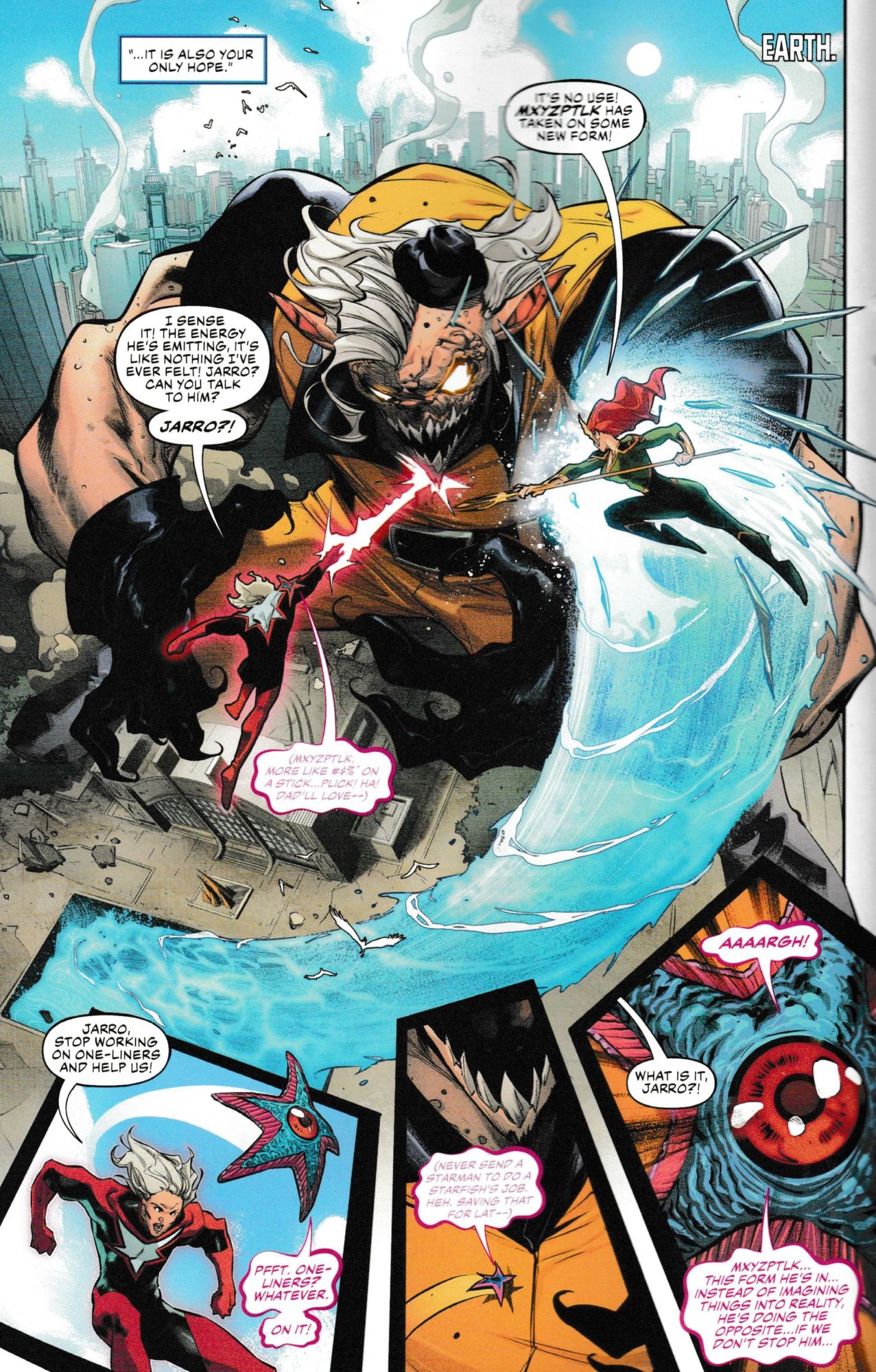 Mister Mxyzptlk continues to kick it off in Justice League #21 by Scott Snyder, Jorge Jimenez, Alejandro Sanchez, Tom Napolitano, Andrew Marino and Marie Javins out today. No sign of Bat-Mite yet though. But as the remaining members of the Justice League in the present, Starman, Mera and Starro try and take him on, he seems to have another trick…