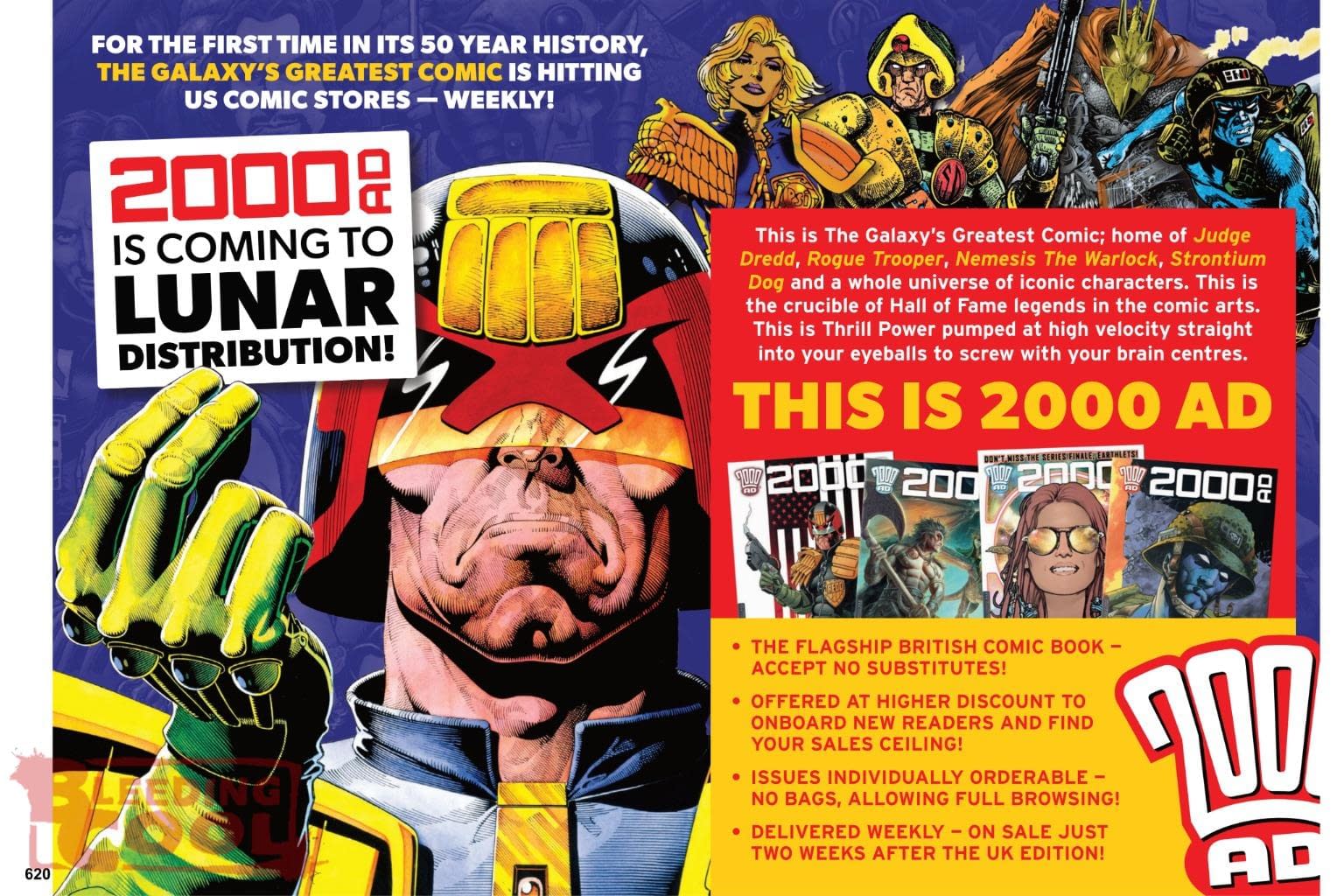 A limited run of 2000AD will now be printed in North America and made available, weekly, for the first time in the US, through Lunar Distribution, and priced at eight dollars each. The UK price is £7.50, or around $6, but this is intended for US retailers to be allowed to make more money on the comic, to help push it to readers… just in time for John Wagner's final Judge Dredd story.