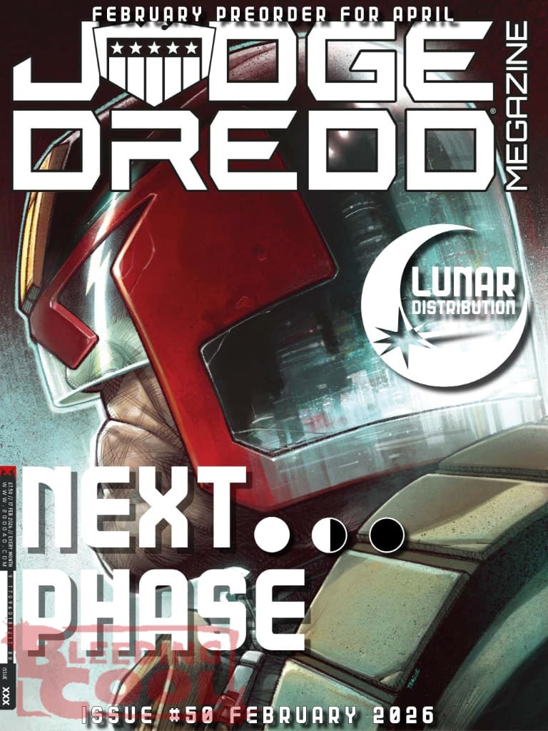 The monthly Judge Dredd Megazine makes its debut in Rebellion's April 2026 solicits and solicitations, marking the first time they have managed to get the British publication to US shores outside of Diamond in living memory. Will the 2000AD weekly title be far behind? And to make the occasion, it's on the front of the Lunar Distribution Next Phase digital magazine for the month…
