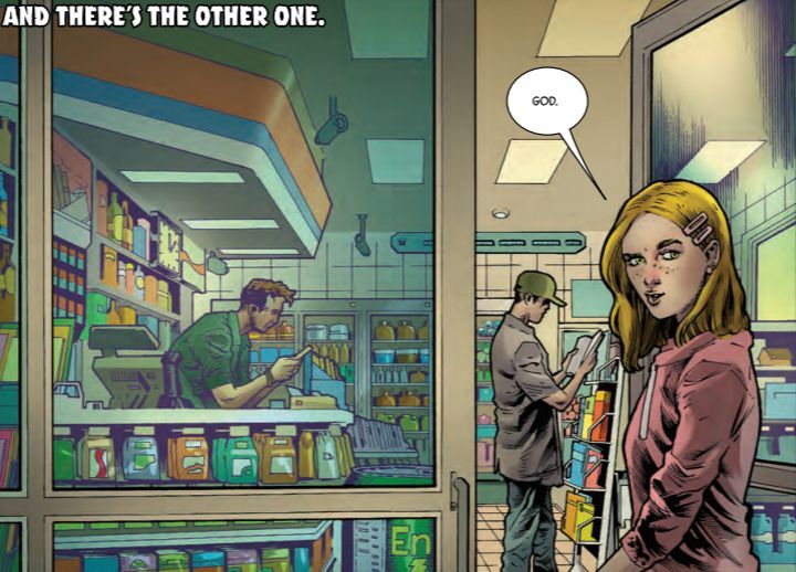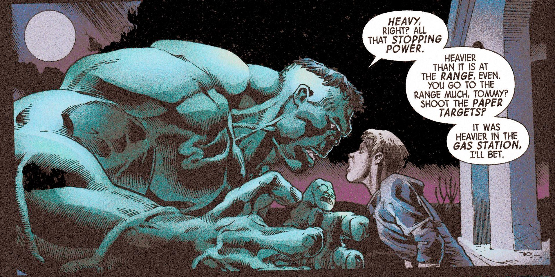 Well, Al Ewing has also been inspired by those early issues and has found a very similar execution, again, the empty stretches of road, with motels, gas stations and diners dotted across, small towns that serve the traveller and a place for terrible people to hide. With Joe Bennett, Ruy Jose and Paul Morris's dark pools of shadow to hide that multitude of sins. The tone is very similar to those Bruce Jones stories, slow, dark, tortured, though with more Hulk up front. And something of the Peter David line about Bruce Banner putting a gun in his mouth, firing, and someone else spitting the bullet out. This is a Hulk of nightmares, huge, blotting out the page, covering the moon that summons him from the grave. And a figure embodying revenge. He talks a complicated language, and he knows what you have done. He is the devil and your sins will find you out.