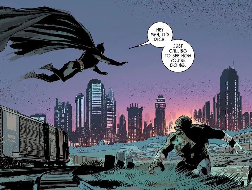 At times, I am surprised that Tom King was in the CIA due to his Batman run seemingly being all about not being secretive. Batman and Catwoman beat up a villain and announce when and where they are going to get married right in front of the person they are fighting. It would not be a Tom King Batman if Batman was not talking on his radio and name-dropping people in his civilian identity as he punches one of the villains he fights. Heck, in Batman #51, Dick drops his own name while swinging into Killer Croc.