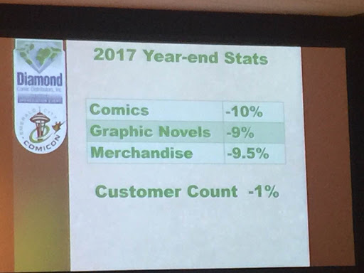 He began with some familiar statistics. For 2017, Comics sales were down 10 percent, Graphic Novels down 9 percent, Merchandise down 9.5 percent — although customer count only came down 1 percent.