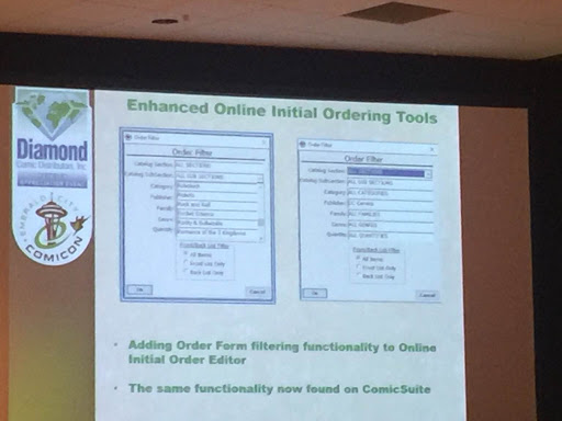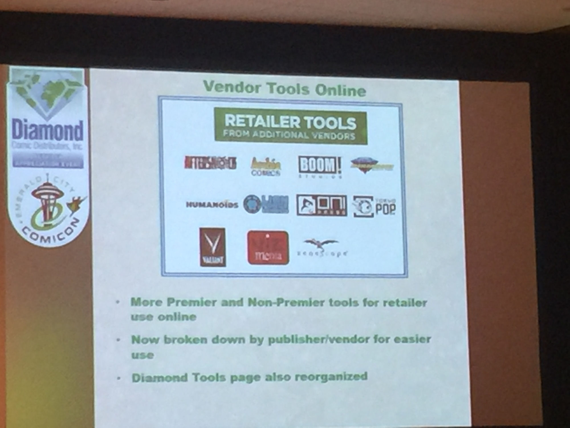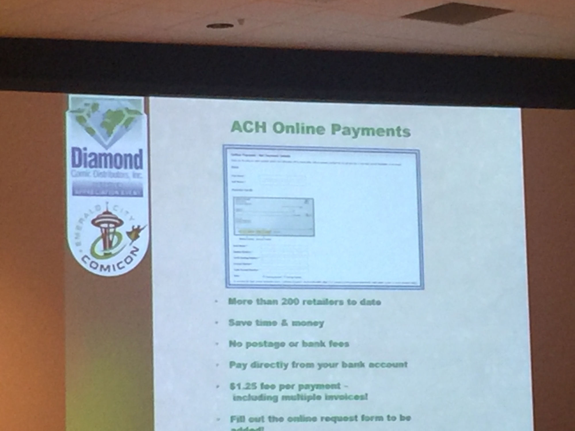 They point out that Vendor Tools, information supplied by publishers to retailers through Diamond's website, is not getting used as much. Diamond highlighted to retailers that preview pages and trailers are available there, that they have recently been reorganized and their new updates came from retailer suggestions. The long-awaited ACH online payments are being made available to retailers — it is still in testing, but retailers can add it now. And it's free to retailers.
