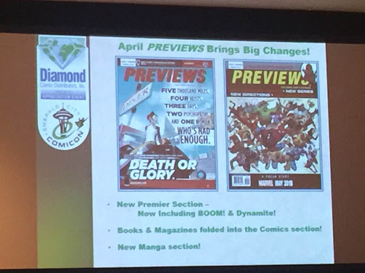 Chris looked through changes coming, with DC Comics moving out of the front of Previews and Boom! and Dynamite coming in. They are moving books and magazines into the comics section, but manga will go back into its own section. And merchandise will take the flipside and back cover to the Previews catalogue.