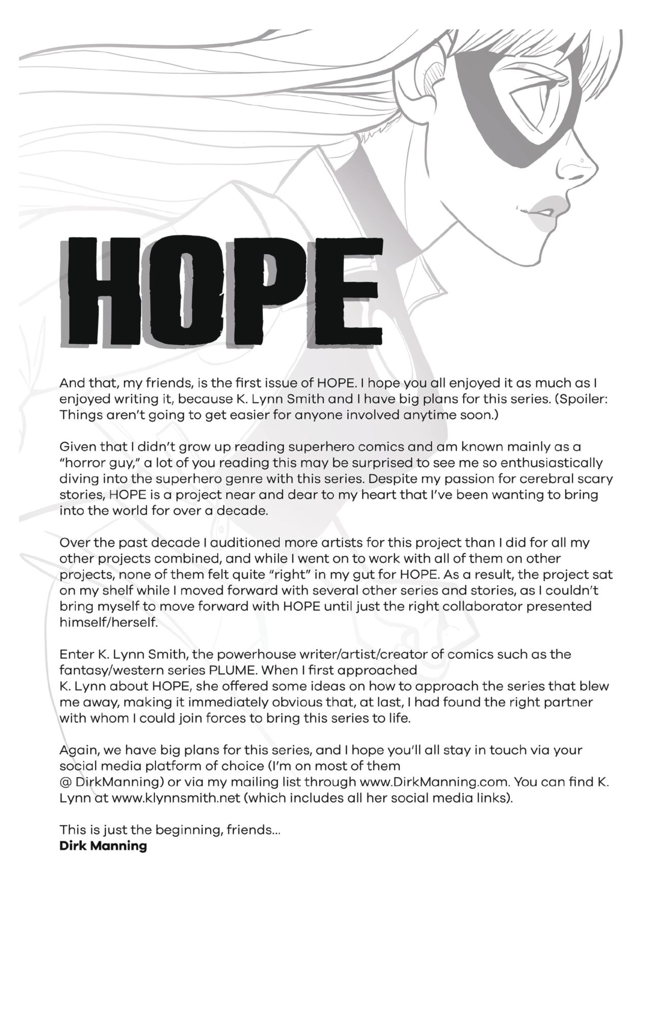 But the first issue came out back in May, for Free Comic Book Day and may be harder to find than most at this stage. So here, on Bleeding Cool is Hope #1 – also by Dirk Manning and K Lynn Smith – we have the full first issue to read, free, just like it was on Free Comic Book Day. If you could find it…