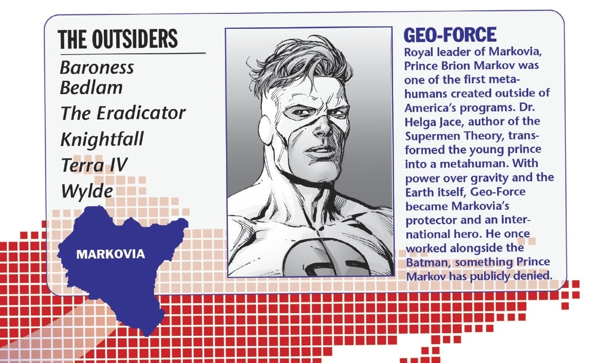 Geo-Force – Prince Brion Markov, brother of the first Terra and royal head of Markovia. Founding member of The Outsiders, he first appeared in a special insert in The Brave and the Bold #200 in 1983 and was created by Mike W. Barr and Jim Aparo.