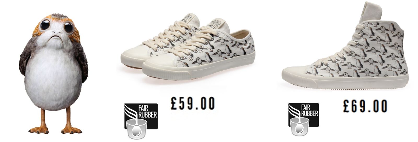 The new line is headed up by the key Porg style low-cut £59 (about $80) and high-top £69 (about $95), with the Porg images printed onto organic cotton and signature Star Wars | Po-Zu tongue detail.