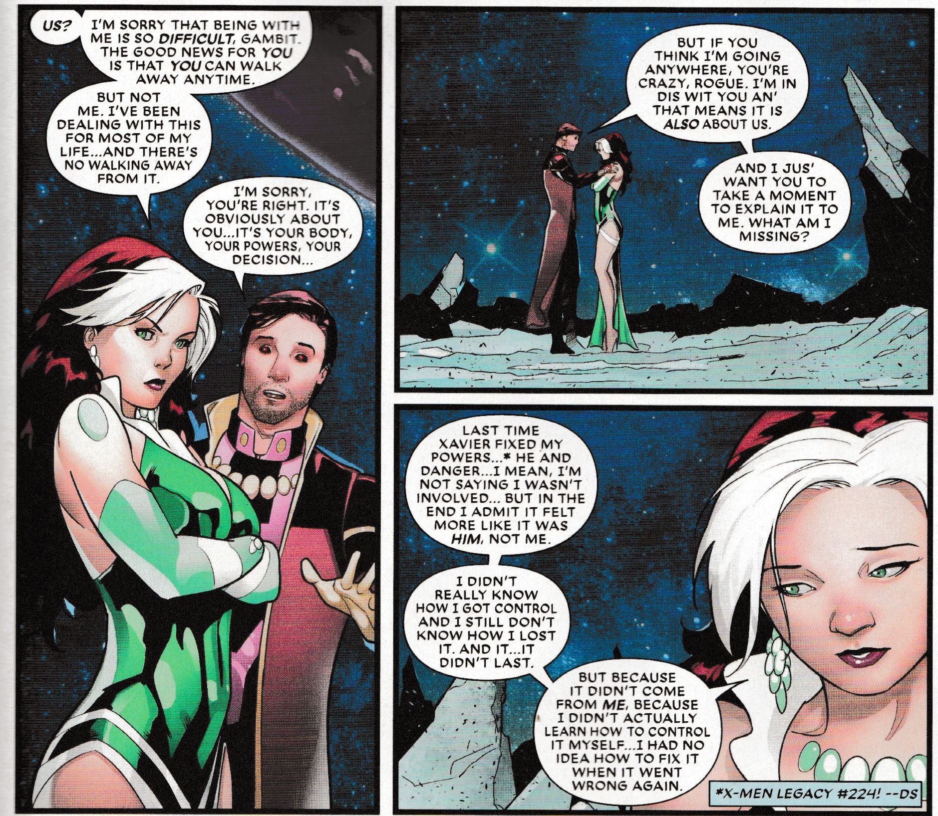 In today's Mr & Mrs X #4, Kelly Thompson and Oscar Bazaldua give us a Rogue who has the potential, courtesy of Lilandra and Chandra, to have her power base sorted out. Restricted, placed under control. And allowing her to touch Gambit – and others – without the curse of her powers draining their lifeforce. Slam dunk?