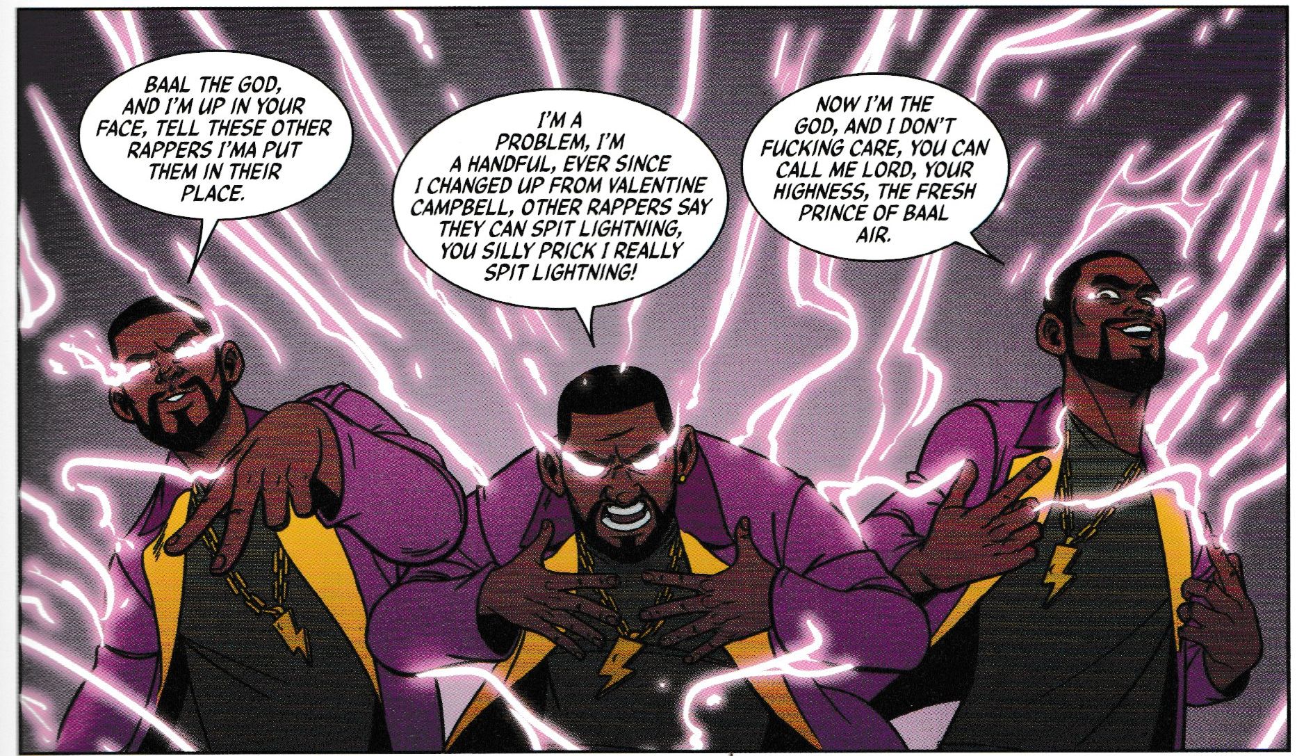 There's lots to love in The Wicked + The Divine Funnies, out today from Image Comics. But I did want to highlight this moment, written by British comedian and presenter Romesh Ranganathan, as Baal spits out some lyrics, part of a very funny scene with an emergent wingman, drawn by Julia Madrigal, coloured by Dee Cunniffe.