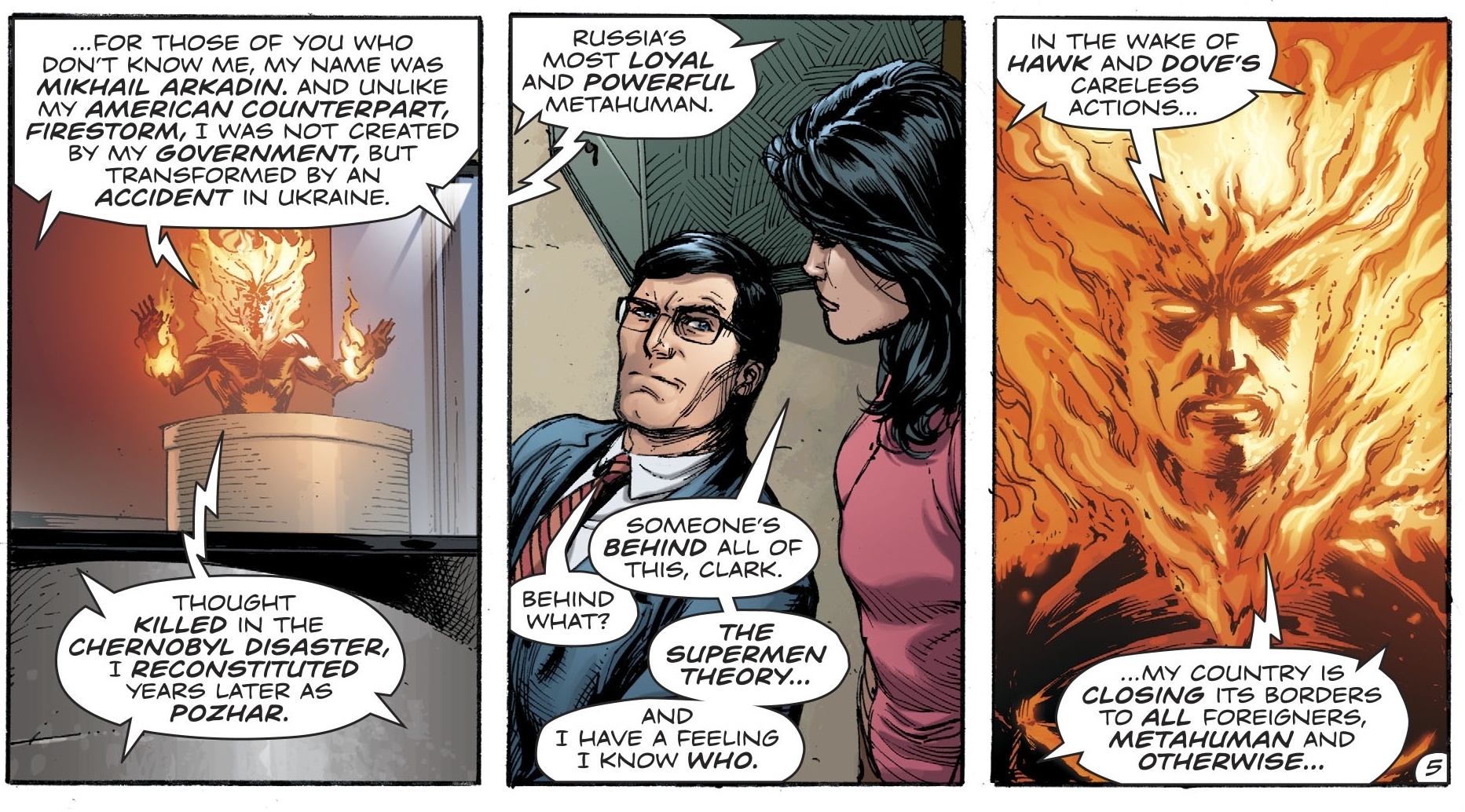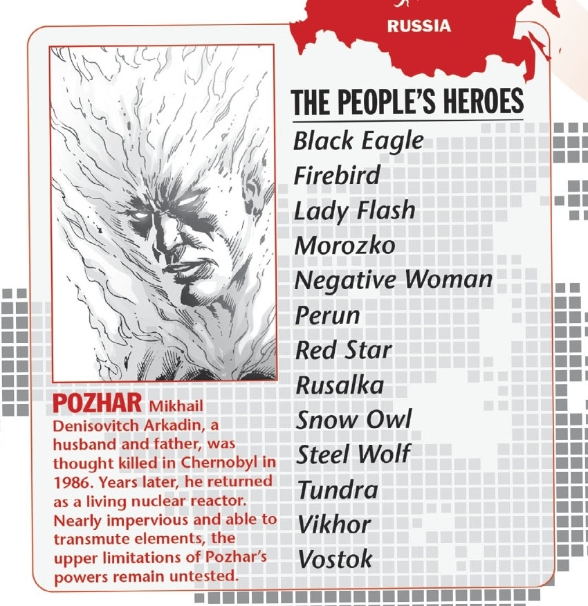 Pozhar – Pozhar (Пожар or "Fire") is a Russian superhero created by John Ostrander and Joe Brozowski in Fury of Firestorm #62 in 1987. Mikhail Arkadin is a nuclear technician who worked at the Chernobyl nuclear power generating plant. As a result of the accident at the plant's #4 reactor, he is imbued with the ability to convert matter into energy. He is recruited by Major Zastrow of the Red Shadow as one of the Soviet Union's official superheroes. And now, in Doomsday Clock, claiming much more…