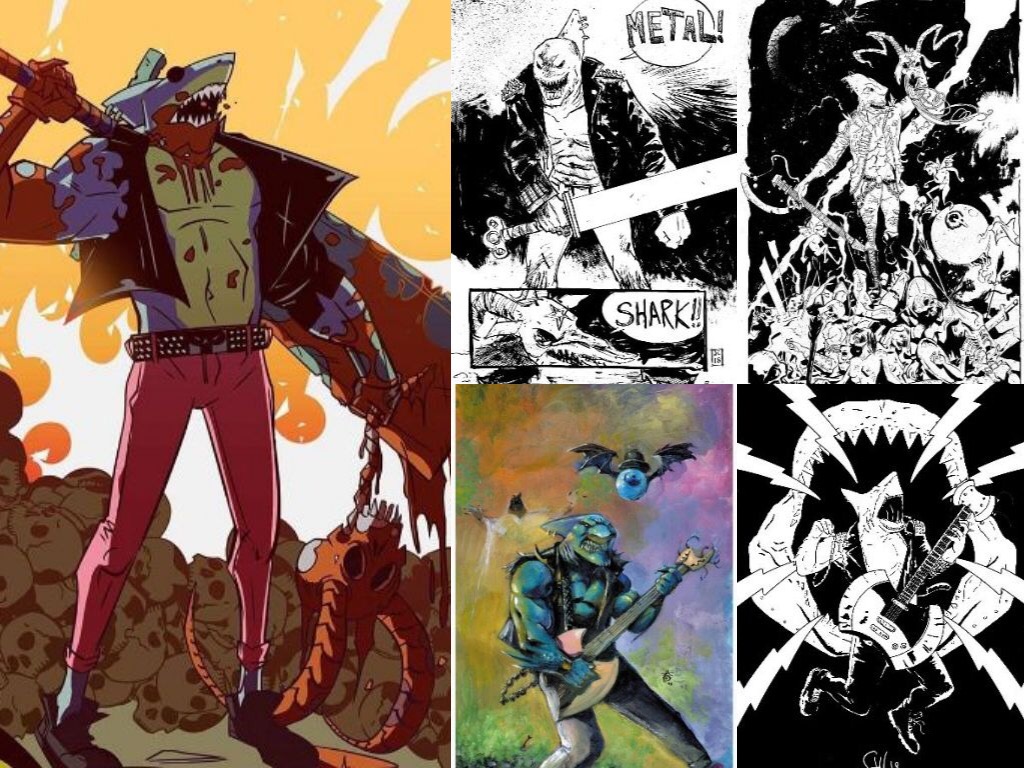 Metalshark Bro was born on the long and desolate highways of West Virginia. In the early hours of a brisk and foggy October morn, I, a weary and homesick writer heard a radio DJ read a news story about scientist placing speakers blasting AC/DC in water to gauge the reaction of sharks. An idea went off like a bomb in my skull. I frantically phoned my friend and co-writer, the majestically bearded Kevin Cuffe to discuss this revelation! Over the next 7 hours, Kevin and I giggled like stoned teenagers as we transformed this news story into the saga of the demonic, half-man, half-shark killing machine!