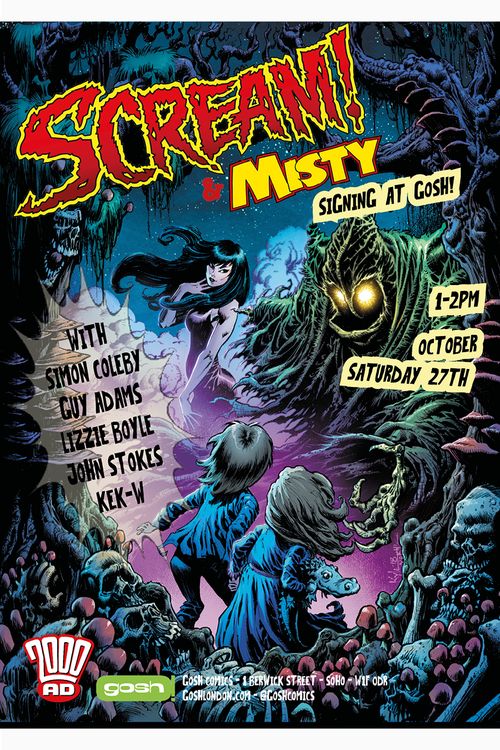 Dun dun dun! It's back! Scream and Misty One-Shot returns for a second outing of old school ghouls and we've got another scream-a-riffic signing to go with it! Scary Simon Coleby, Grisly Guy Adams, Lycanthropic Lizzie Boyle, Jeepers John Stokes and Kreepers Kek-W will all be here from 1-2 pm on Saturday Otober 27th to put their spooky scribbles on your copies of the magazine! (They're all lovely really).