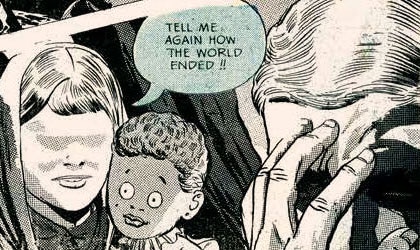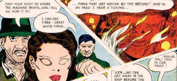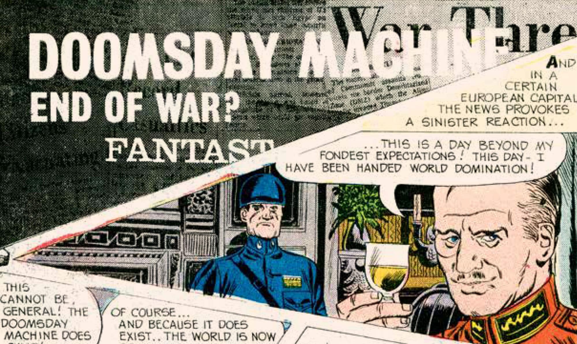 The Charlton story that stood out to Moore, Children of Doom, seems to provide the alternative path that continues from Watchmen's climax. The UN's peacekeeping mission is noted here, but now the implication is that the Cold War arms build-up is destined to fail. An analog to Watchmen's Doomsday clock — an actual Doomsday Machine — is introduced. Then it all starts to go horribly wrong.