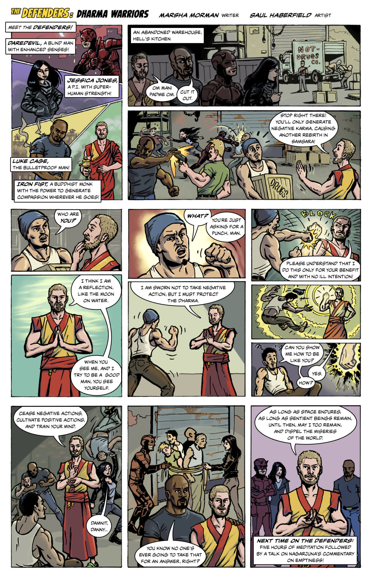 Marsha asked me if Marvel Comics was likely to consider a more realistic version of the Iron Fist comic book that criticised the TV series. That if Danny really was a Buddhist monk, which means that instead of learning kung fu, he would have just spent a lot of time meditating and memorizing sutras, and when he gets back to America, when people ask him to use his Iron Fist powers, he just tells parables about the Buddha to explain the cycle of negative karma.