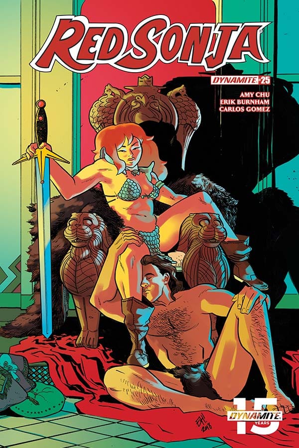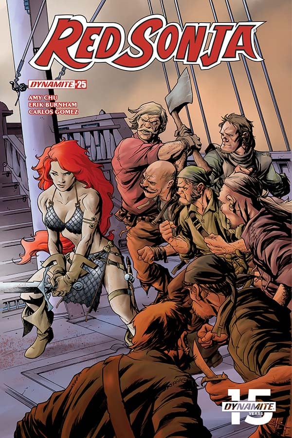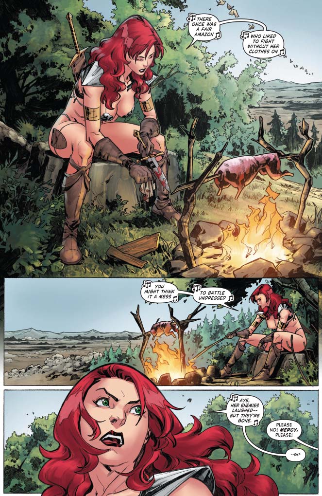 Tomorrow sees the release of Red Sonja #25, the final issue in this series before Sonja is rebooted under the pen of Mark Russell, the pencil of Mirko Colak, the photoshop brushes of Dearbhla Kelly, and the speech bubble vectors of Hassan Otsmane-Elhaou. But first, we get one more issue by Amy Chu, Erik Burnham, and Carlos E. Gomez, and in a preview of the issue, we see that Sonja wastes absolutely no time before… singing a bawdy limerick?
