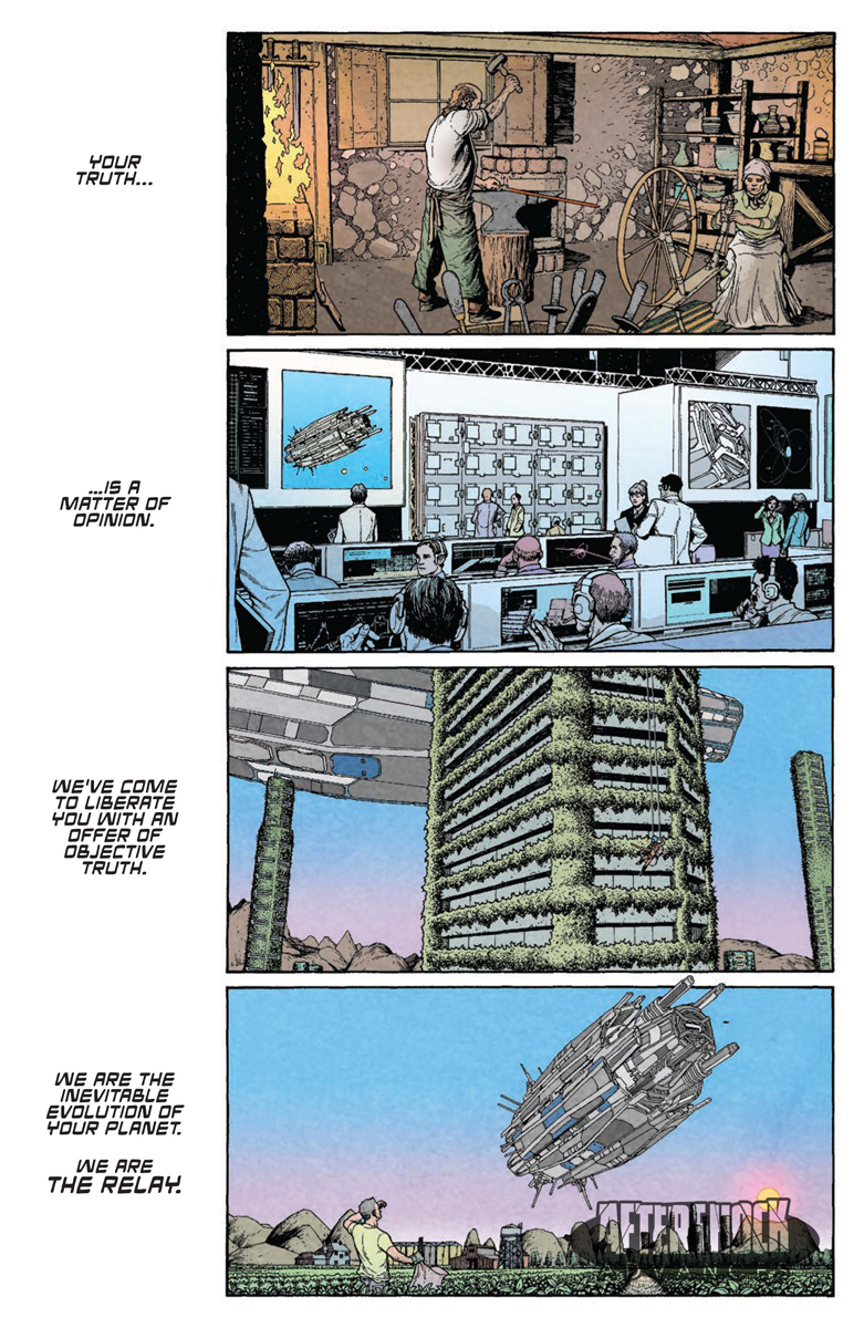 As I said, I really don't understand much of anything that was going on to begin with, mostly around the captions in the FCBD issue — stuff about societal ideals, critiques on modern life, religion, and science. That's alright, though, since it was compelling anyway, as (thankfully) underpinning it all is a ripping sci-fi yarn.