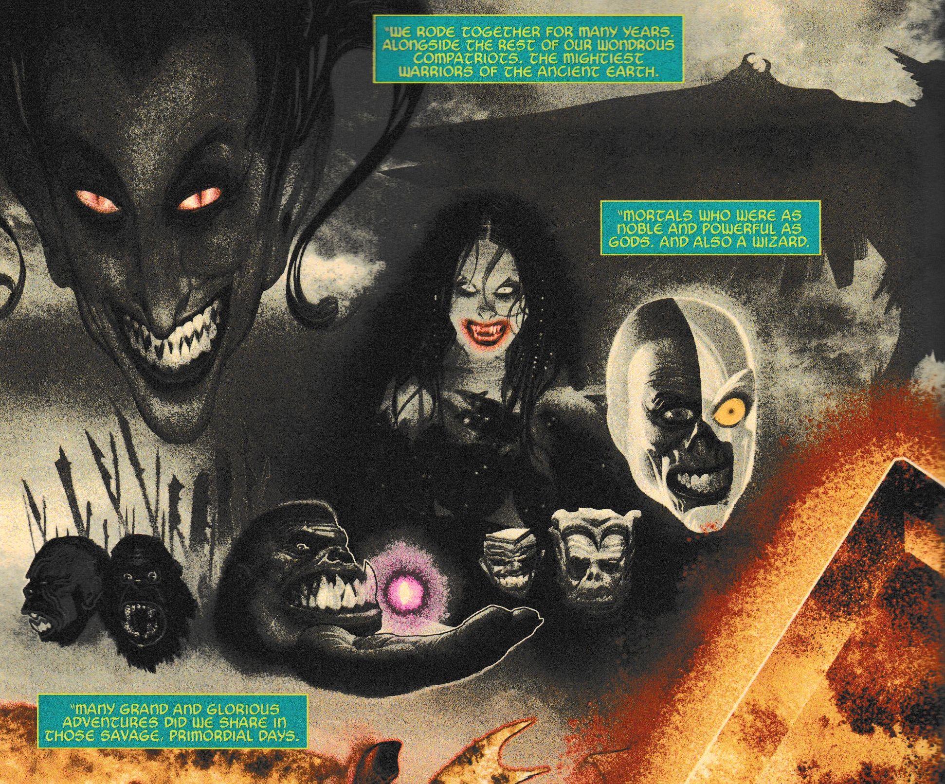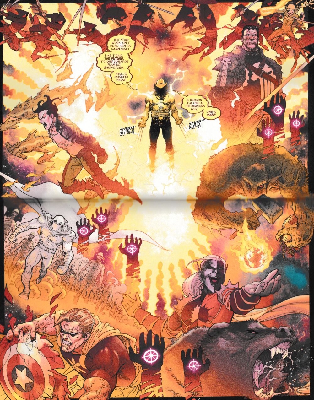 Man Thing getting the hammer and the helmet. Hyperion getting the shield? Moon Knight leading the dead? Hyperion swinging the shield? Has there been a superhero jumble sale been going on? And which Wolverine is this anyway? Are those fiery claws?