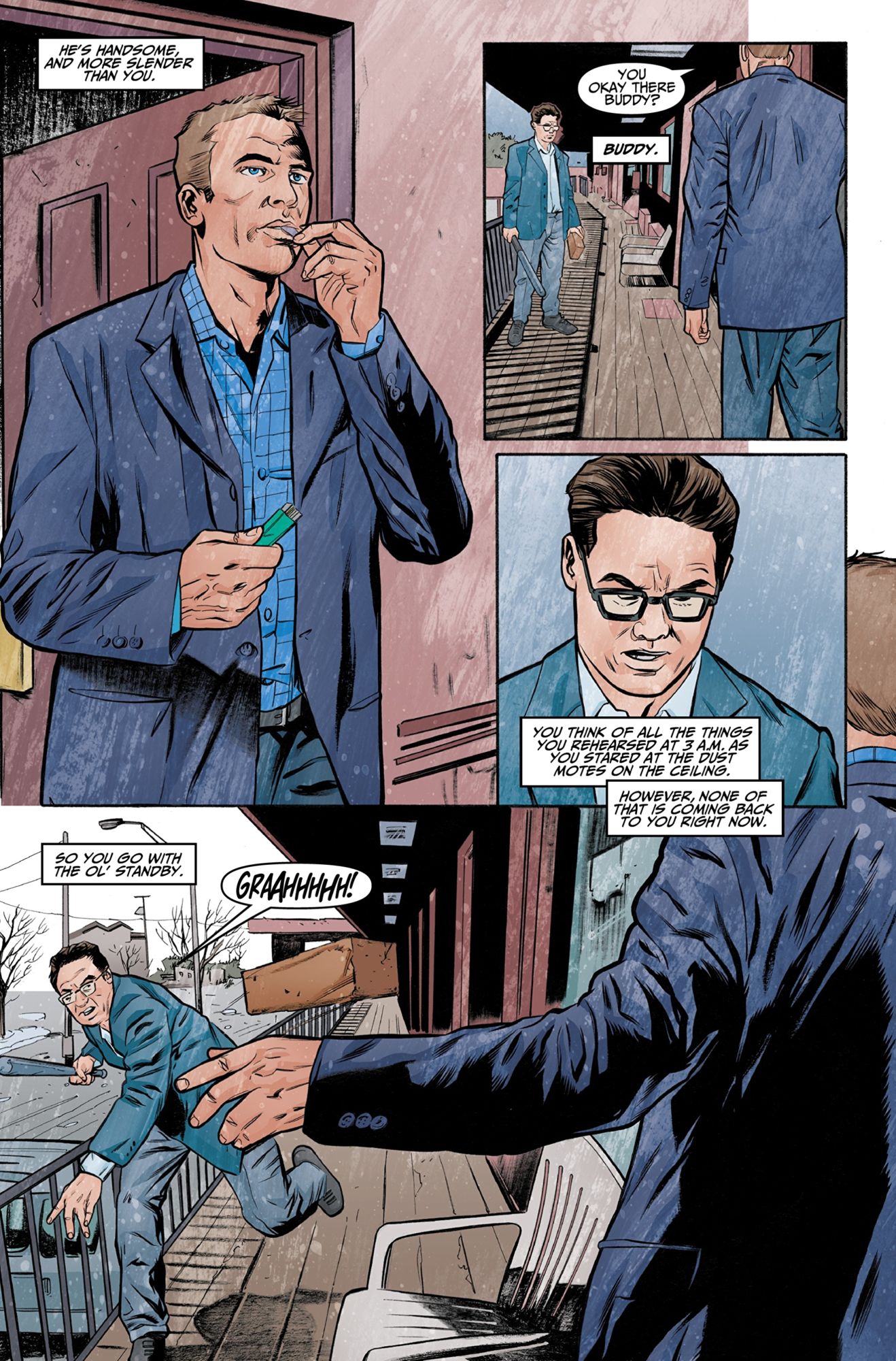 Joe Hayward is a nebbish on the warpath. He's going after the guy who might be sleeping with his wife. He arrives at the motel they're at with a baseball bat and a brick. The guy he wants to beat the crap out of is Scott Majeski.