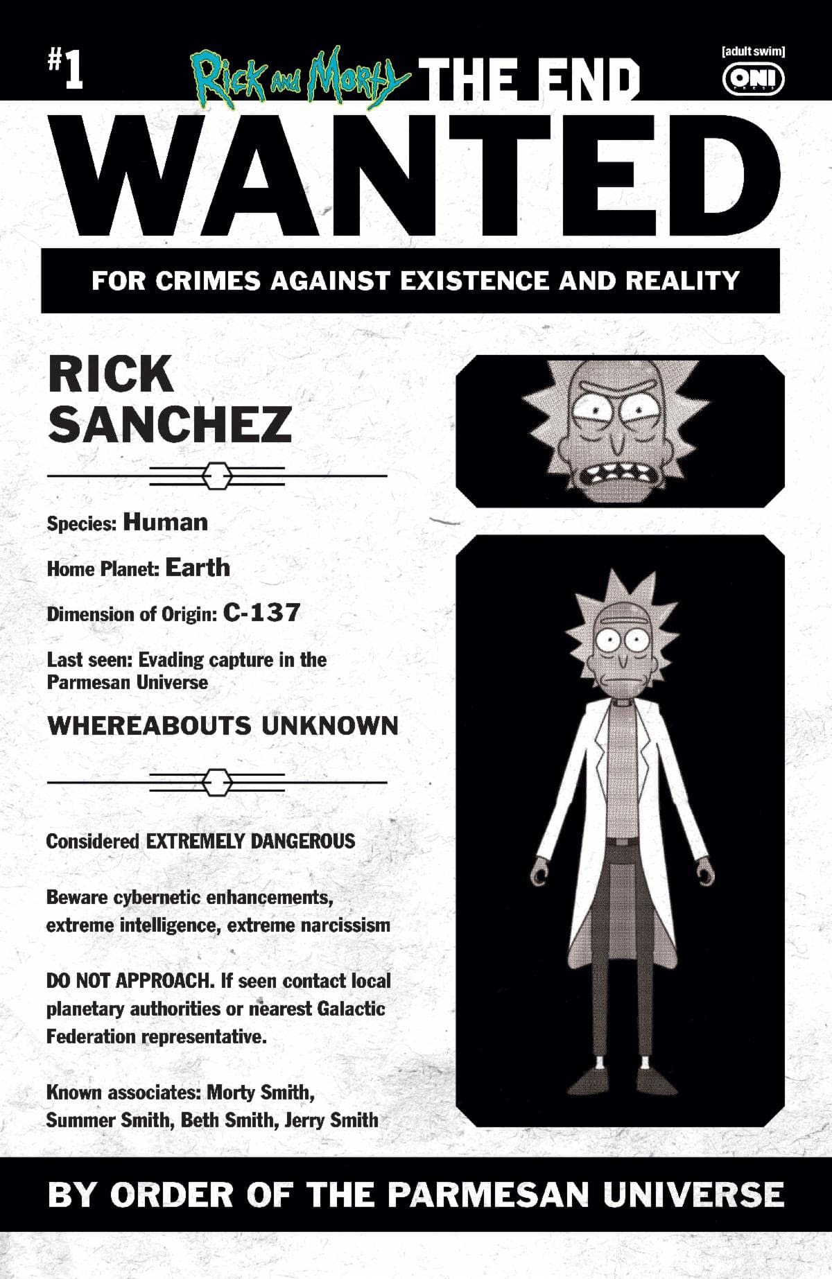 "Comic book readers will find it all starts here as Rick Sanchez, the most wanted man in this and every other universe, is on the run. With a bounty on his head, every government, military, pirate, mobster, bounty hunter, bail bondsman, religious institution, theater troupe, circus clown, and endangered species is on the hunt to bring in Rick – DEAD OR ALIVE. The only one who can bring Rick in warm is the one person who knows him best: Morty Smith. But Morty's not the only Smith hot on Rick's trail . . . "Space Beth" Smith is determined to bring Rick in, and she doesn't particularly care how. Now it's just a question of who can get to him first…!