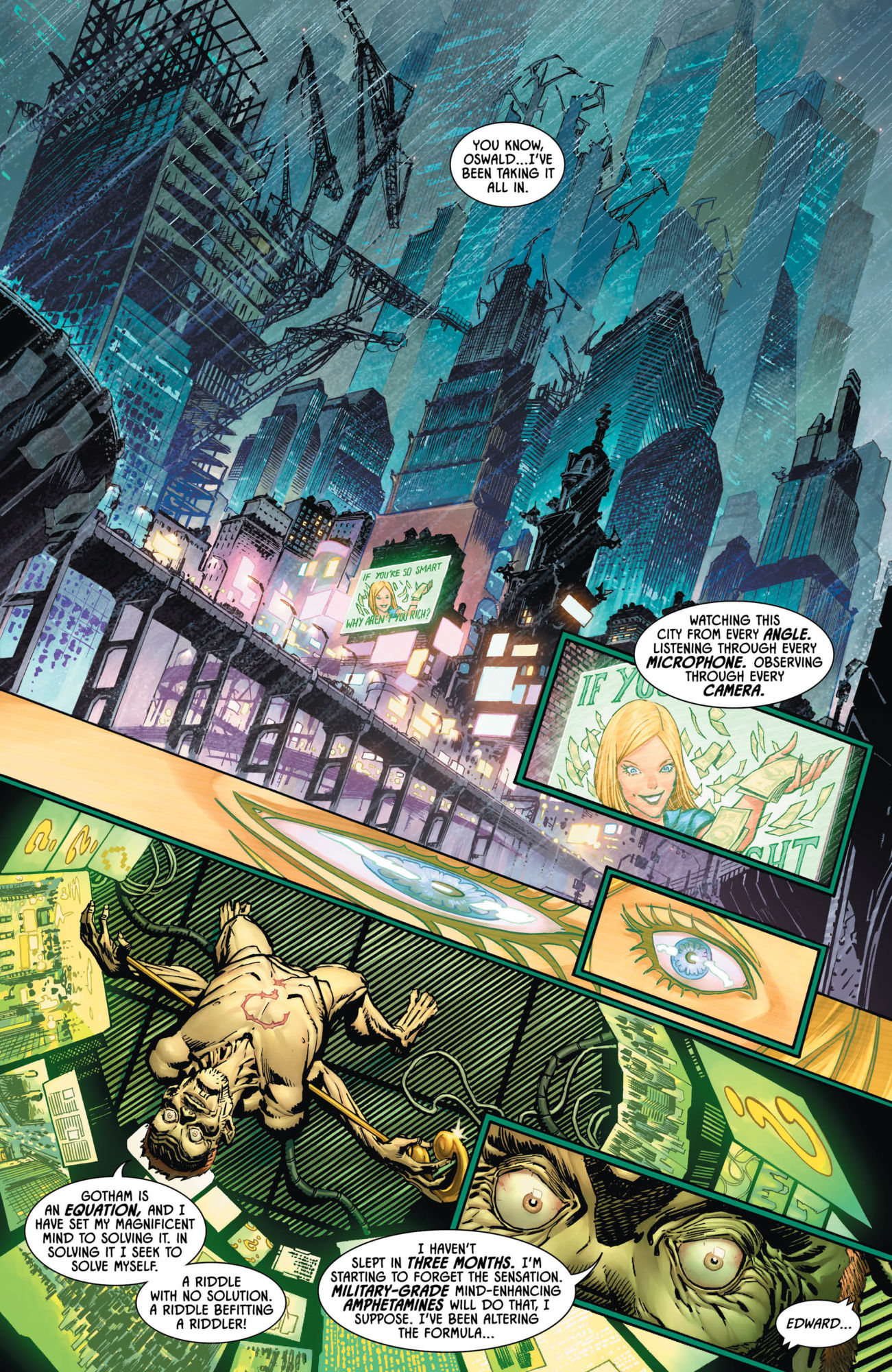 Batman #87 hits stores next week from DC Comics, by James Tynion IV and Guillem March, and we finally catch up with what The Riddler has been up to. Except the Riddler isn't doing too well, by the looks of it, at least in this preview. He's hooked himself up to a massive surveillance computer and kept himself awake with speed for three months. We're not sure why it's taken such a toll on him, though. Isn't this pretty much how everyone in the video game industry works in the months leading up to a game release?