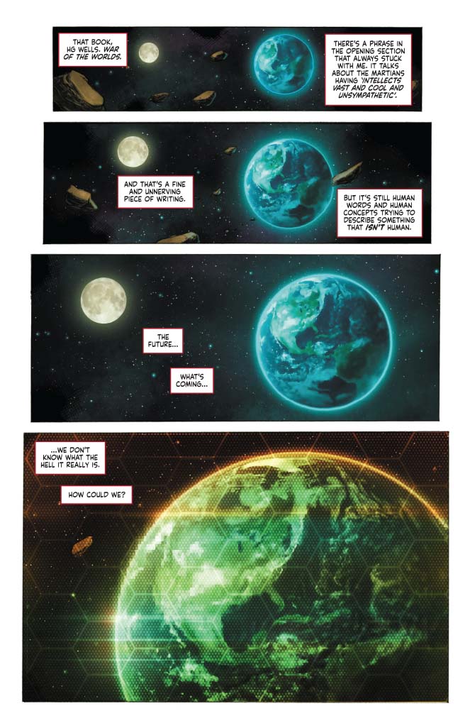 This is all about that line from War of the Worlds, "Intellects vast and cool and unsympathetic." Such a good, creepy line. So I'm piggy-backing on that and trying to build some tension straight away. Something's looking at our world and it's hungry, and it's coming. Immediate danger and tension.
