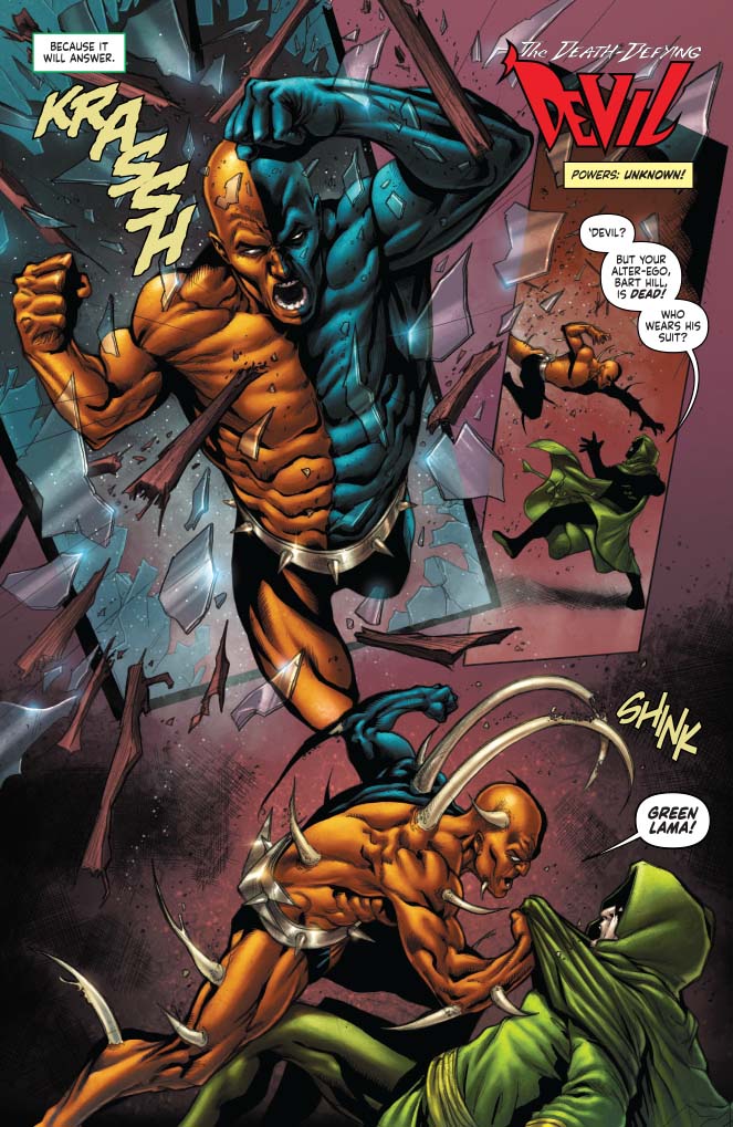 Some clunky exposition here with the "Bart Hill? But your alter-ego is dead." But sometimes needs must. There's way more graceful ways of doing that dialogue, but we don't have a lot of space here, with 16 pages. So: mea culpa. And I wanted the Death-Defying Devil to be a threat here, and to have the space for some cool visuals. We've not seen his suit do this before. And if his alter-ego is dead, who is this?
