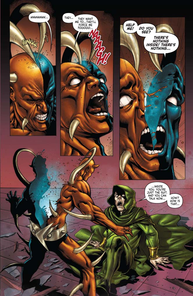 I wanted this to be… freaky. Which Sergio's done very well. And it's also thematic. This story is about finding heart and substance in these characters, so, there's no one inside the Devil's suit anymore… no substance. That's our series arc — find substance in these characters.