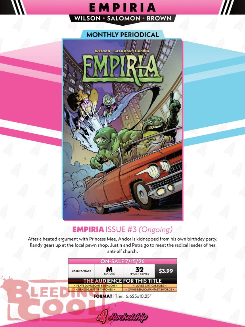 - Rocketship July 2026 solicits spotlight Empiria #3, with Andor kidnapped, Randy arming up, and Petra chasing danger.
