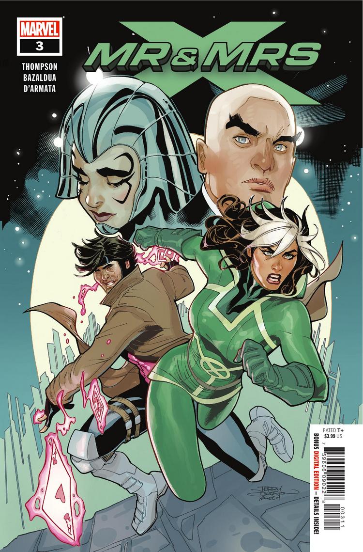 In Mr. and Mrs. X, by Kelly Thompson and Oscar Bazaldua, newlyweds Rogue and Gambit are doing their best to enjoy a honeymoon in space that's gone completely off the rails. But though they should be the ones making babies, it seems that's already been taken care of by two characters who are currently deceased. Or to be more accurate, it was taken care of using their genes by someone else.