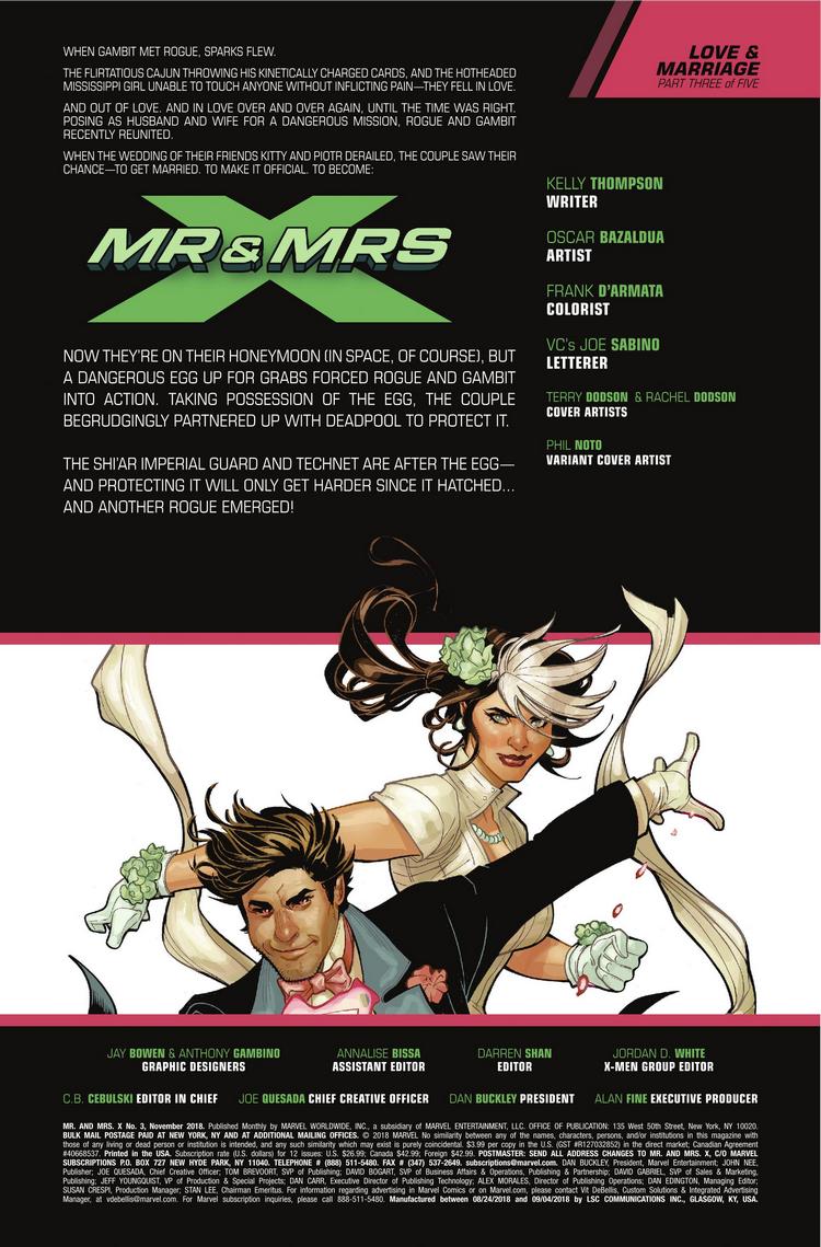 ROGUE and GAMBIT'S romantic getaway is but a faint memory as they're forced to team up with DEADPOOL to protect a dangerous and extremely valuable "package" when half the galaxy comes to claim it. What secrets does the package hold that the Imperial Guard and Deathbird (with an entire Shi'ar rebellion in tow!) will risk everything for? More importantly, can Rogue, Gambit, and Deadpool stop bickering long enough to win?