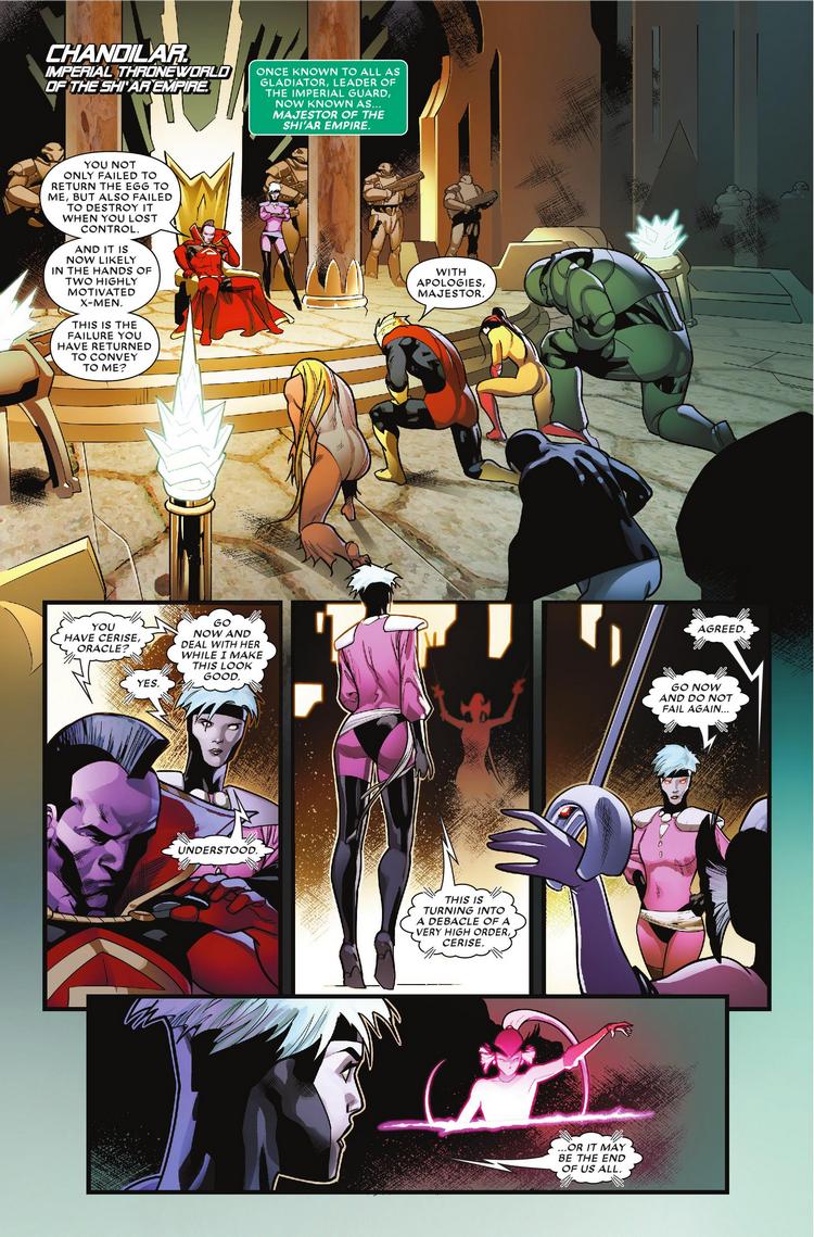 Last issue, the mysterious egg that was inside the mysterious package that Kitty Pryde asked Rogue and Gambit to pick up hatched, revealing a doppelganger of Rogue. If you thought that was weird, it's about to get weirder. According to Kitty in this preview or Mr. and Mrs. X #3, the egg contained the genetically engineered child of deceased X-mentor Professor Charles Xavier and deceased former Sh'iar Majestrix Lilandra Nermini. Apparently, looking like Rogue is a psychic defense mechanism.